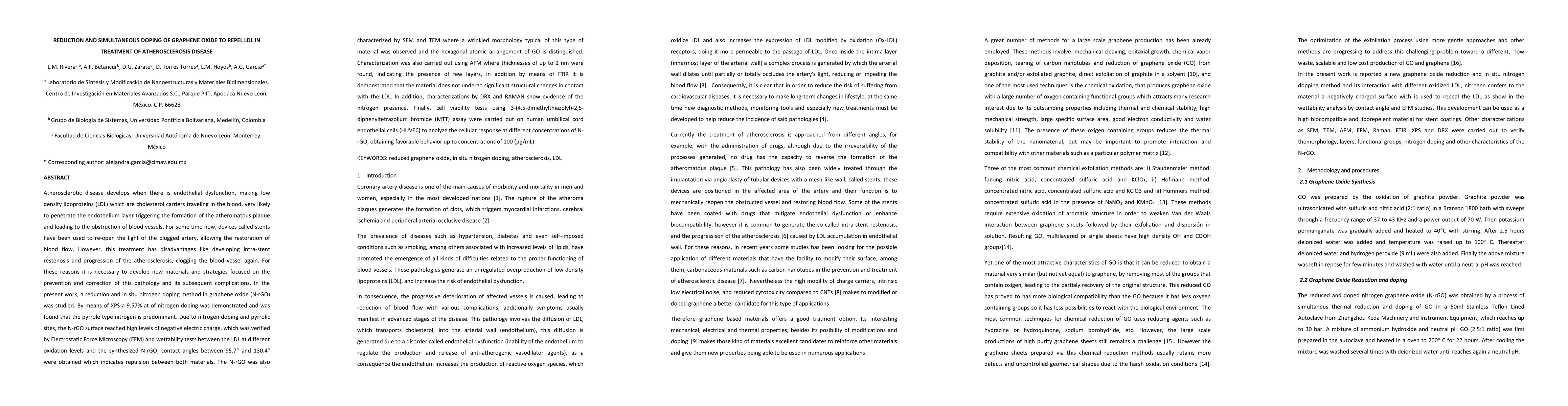 Atherosclerotic disease develops when there is endothelial dysfunction, making low density lipoproteins (LDL) which are cholesterol carriers traveling in the blood, very likely to penetrate the endothelium layer triggering the formation of the atheromatous plaque and leading to the obstruction of blood vessels. For some time now, devices called stents have been used to re-open the light of the plugged artery, allowing the restoration of blood flow. However, this treatment has disadvantages like developing intra-stent restenosis and progression of the atherosclerosis, clogging the blood vessel again. For these reasons it is necessary to develop new materials and strategies focused on the prevention and correction of this pathology and its subsequent complications. In the present work, a reduction and in situ nitrogen doping method in graphene oxide (N-rGO) was studied. By means of XPS a 9.57% at of nitrogen doping was demonstrated and was found that the pyrrole type nitrogen is predominant. Due to nitrogen doping and pyrrolic sites, the N-rGO surface reached high levels of negative electric charge, which was verified by Electrostatic Force Microscopy (EFM) and wettability tests between the LDL at different oxidation levels and the synthesized N-rGO; contact angles between 95.7{\deg} and 130.4{\deg} were obtained which indicates repulsion between both materials. The N-rGO was also characterized by SEM and TEM where a wrinkled morphology typical of this type of material was observed and the hexagonal atomic arrangement of GO is distinguished. Finally, cell viability tests using 3-(4,5-dimethylthiazolyl)-2,5-diphenyltetrazolium bromide (MTT) assay were carried out on human umbilical cord endothelial cells (HUVEC) to analyze the cellular response at different concentrations of N-rGO, obtaining favorable behavior up to concentrations of 100 ({\mu}g/mL).