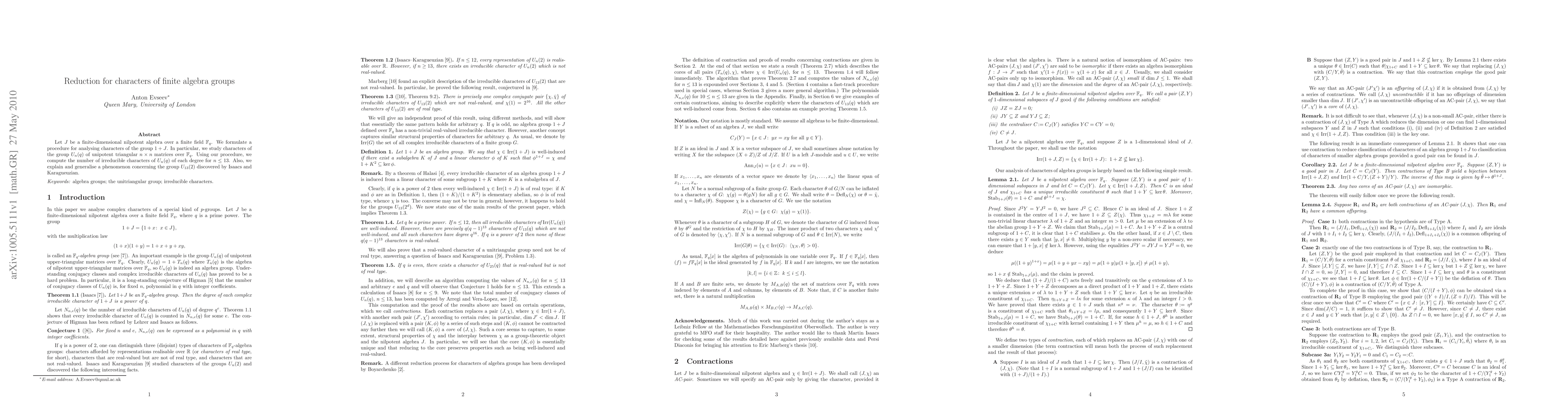 Let J be a finite-dimensional nilpotent algebra over a finite field F_q. We formulate a procedure for analysing characters of the group 1+J. In particular, we study characters of the group $U_n (q)$ of unipotent triangular $n\times n$ matrices over F_q. Using our procedure, we compute the number of irreducible characters of $U_n (q)$ of each degree for n<14. Also, we explain and generalise a phenomenon concerning the group $U_{13}(2)$ discovered by Isaacs and Karagueuzian.