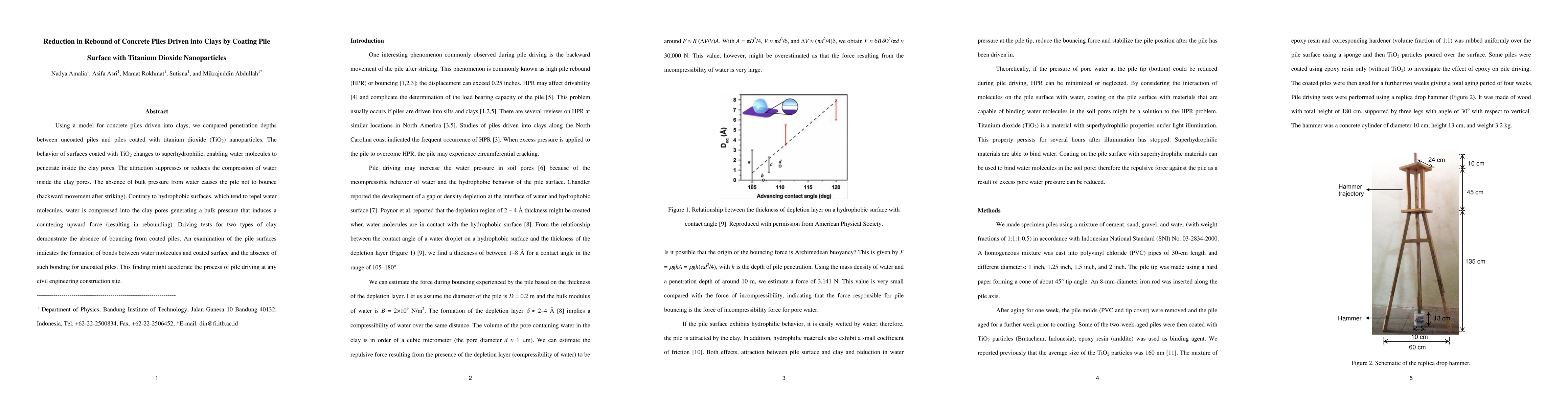 Using a model for concrete piles driven into clays, we compared penetration depths between uncoated piles and piles coated with titanium dioxide (TiO2) nanoparticles. The behavior of surfaces coated with TiO2 changes to superhydrophilic, enabling water molecules to penetrate inside the clay pores. The attraction suppresses or reduces the compression of water inside the clay pores. The absence of bulk pressure from water causes the pile not to bounce (backward movement after striking). Contrary to hydrophobic surfaces, which tend to repel water molecules, water is compressed into the clay pores generating a bulk pressure that induces a countering upward force (resulting in rebounding). Driving tests for two types of clay demonstrate the absence of bouncing from coated piles. An examination of the pile surfaces indicates the formation of bonds between water molecules and coated surface and the absence of such bonding for uncoated piles. This finding might accelerate the process of pile driving at any civil engineering construction site.