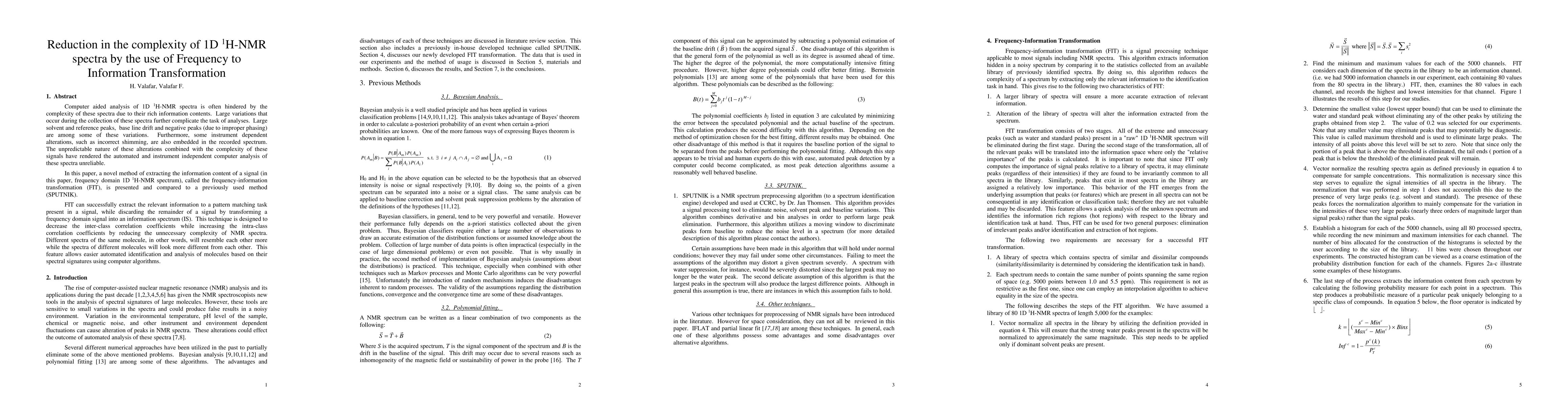 Analysis of 1H-NMR spectra is often hindered by large variations that occur during the collection of these spectra. Large solvent and standard peaks, base line drift and negative peaks (due to improper phasing) are among some of these variations. Furthermore, some instrument dependent alterations, such as incorrect shimming, are also embedded in the recorded spectrum. The unpredictable nature of these alterations of the signal has rendered the automated and instrument independent computer analysis of these spectra unreliable. In this paper, a novel method of extracting the information content of a signal (in this paper, frequency domain 1H-NMR spectrum), called the frequency-information transformation (FIT), is presented and compared to a previously used method (SPUTNIK). FIT can successfully extract the relevant information to a pattern matching task present in a signal, while discarding the remainder of a signal by transforming a Fourier transformed signal into an information spectrum (IS). This technique exhibits the ability of decreasing the inter-class correlation coefficients while increasing the intra-class correlation coefficients. Different spectra of the same molecule, in other words, will resemble more to each other while the spectra of different molecules will look more different from each other. This feature allows easier automated identification and analysis of molecules based on their spectral signatures using computer algorithms.