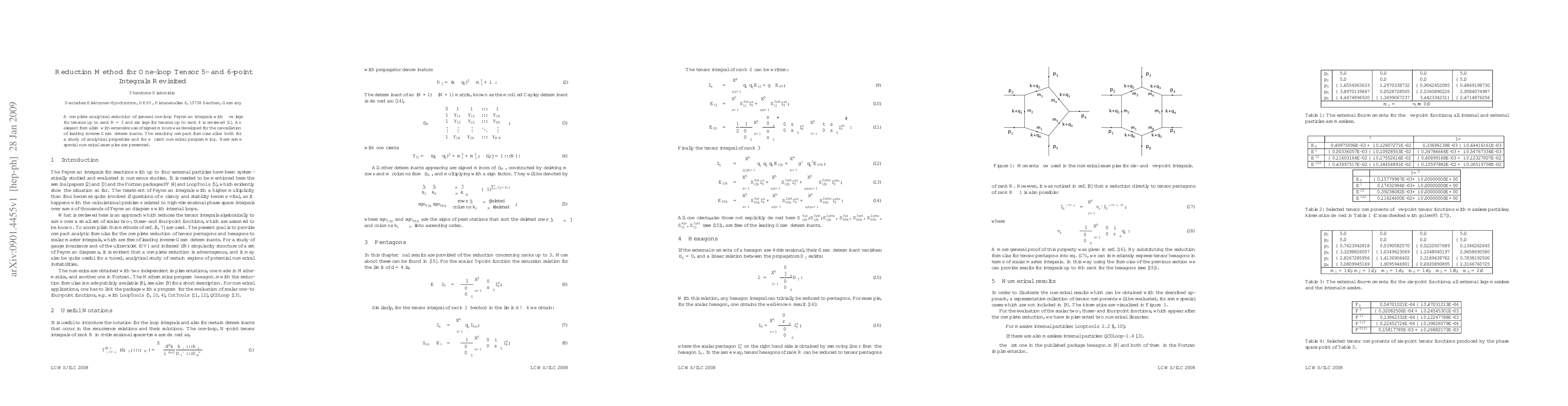 A complete analytical reduction of general one-loop Feynman integrals with five legs for tensors up to rank R=3 and six legs for tensors up to rank 4 is reviewed.
