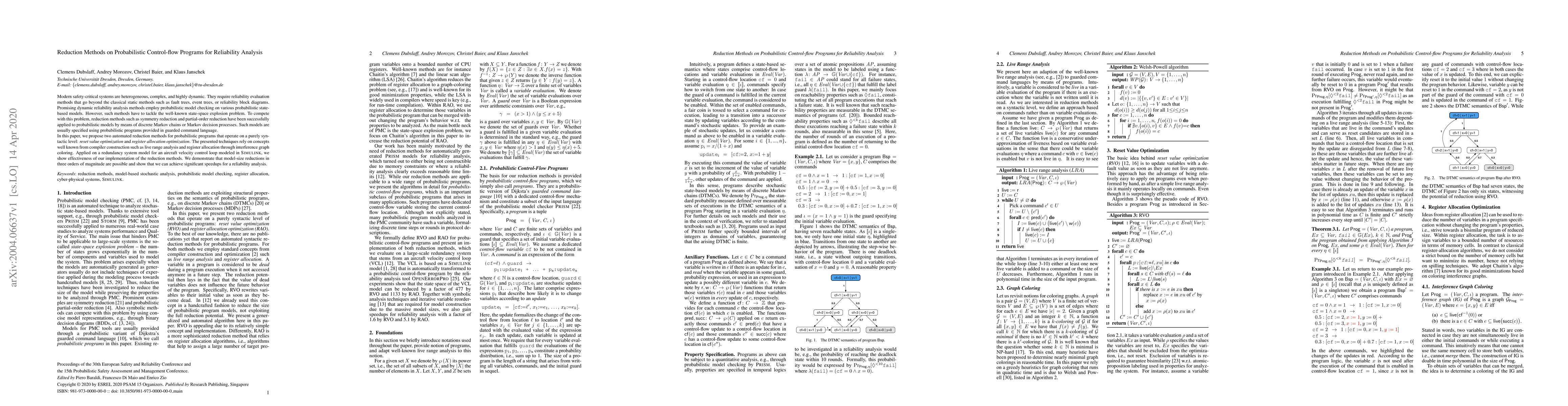 Modern safety-critical systems are heterogeneous, complex, and highly dynamic. They require reliability evaluation methods that go beyond the classical static methods such as fault trees, event trees, or reliability block diagrams. Promising dynamic reliability analysis methods employ probabilistic model checking on various probabilistic state-based models. However, such methods have to tackle the well-known state-space explosion problem. To compete with this problem, reduction methods such as symmetry reduction and partial-order reduction have been successfully applied to probabilistic models by means of discrete Markov chains or Markov decision processes. Such models are usually specified using probabilistic programs provided in guarded command language. In this paper, we propose two automated reduction methods for probabilistic programs that operate on a purely syntactic level: reset value optimization and register allocation optimization. The presented techniques rely on concepts well known from compiler construction such as live range analysis and register allocation through interference graph coloring. Applied on a redundancy system model for an aircraft velocity control loop modeled in SIMULINK, we show effectiveness of our implementation of the reduction methods. We demonstrate that model-size reductions in three orders of magnitude are possible and show that we can achieve significant speedups for a reliability analysis.