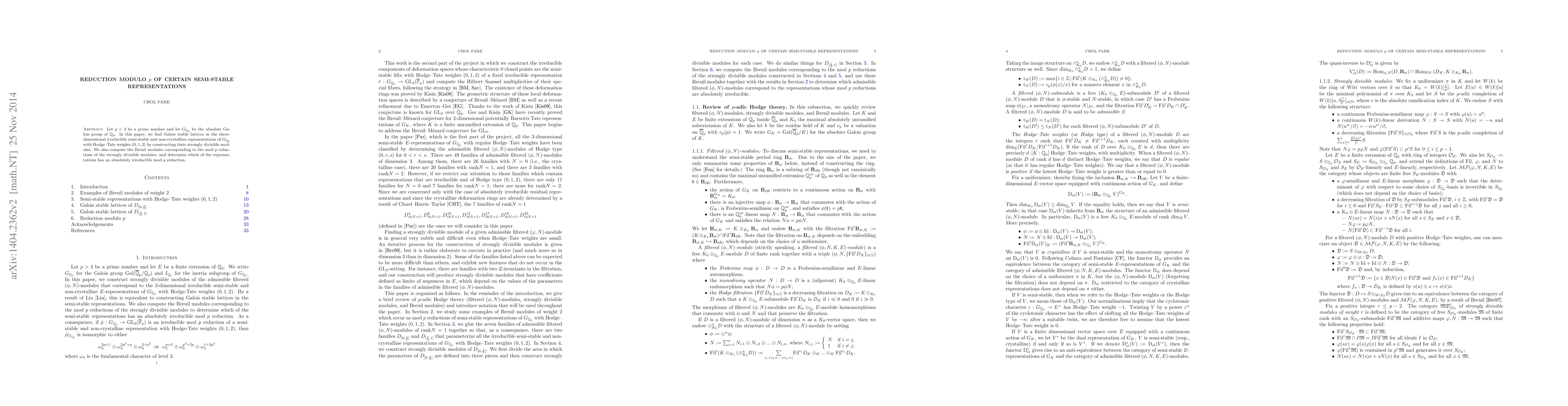 This paper identifies Galois stable lattices in $3$-dimensional semi-stable representations of $G_{\mathbb{Q}_p}$ with specific Hodge-Tate weights, constructs their strongly divisible modules, and computes Breuil modules for mod $p$ reductions, determining which representations have irreducible mod $p$ reductions.