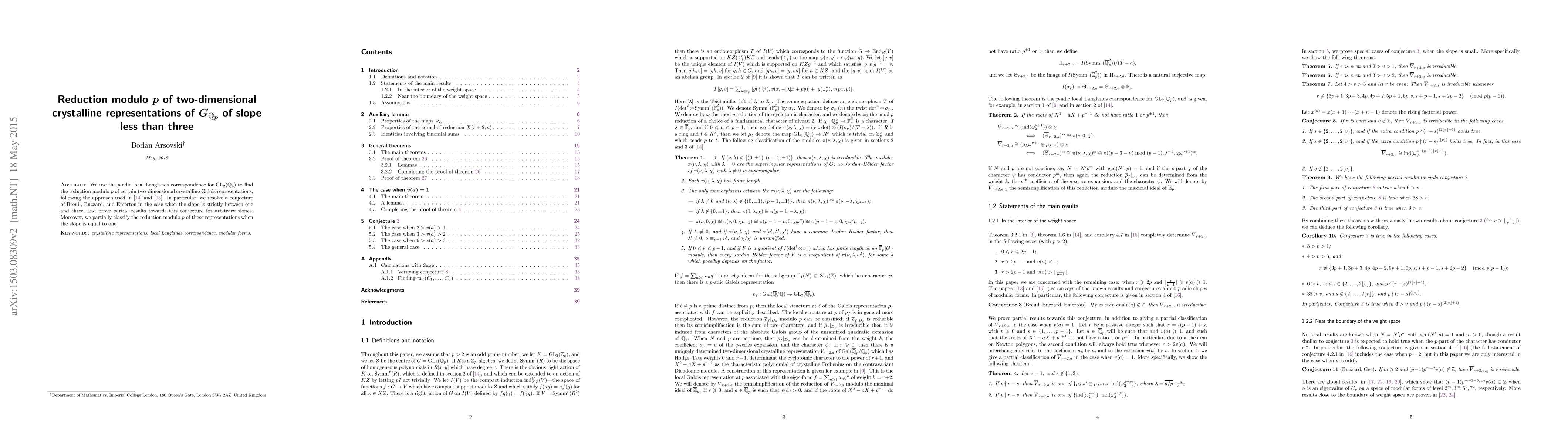 This paper employs the p-adic local Langlands correspondence for GL_2(Q_p) to investigate the reduction modulo p of two-dimensional crystalline representations with slopes less than three, resolving a conjecture for slopes between one and three and classifying reductions for slope one.