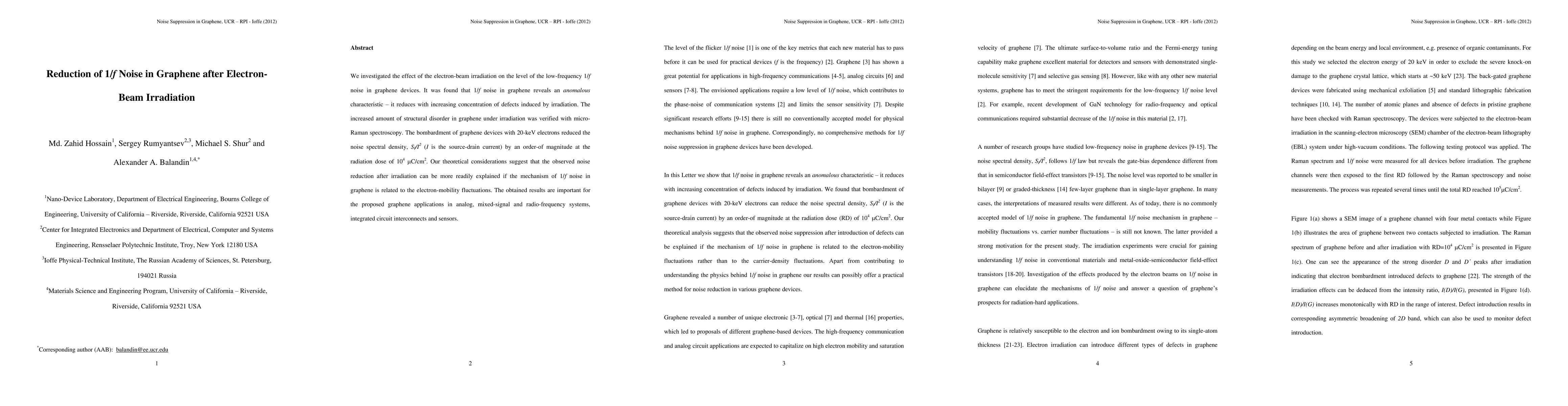 This study demonstrates that electron-beam irradiation significantly reduces 1/f noise in graphene devices, suggesting a link between noise reduction and increased defect concentration and electron-mobility fluctuations, which is critical for graphene's applications in various electronic systems.