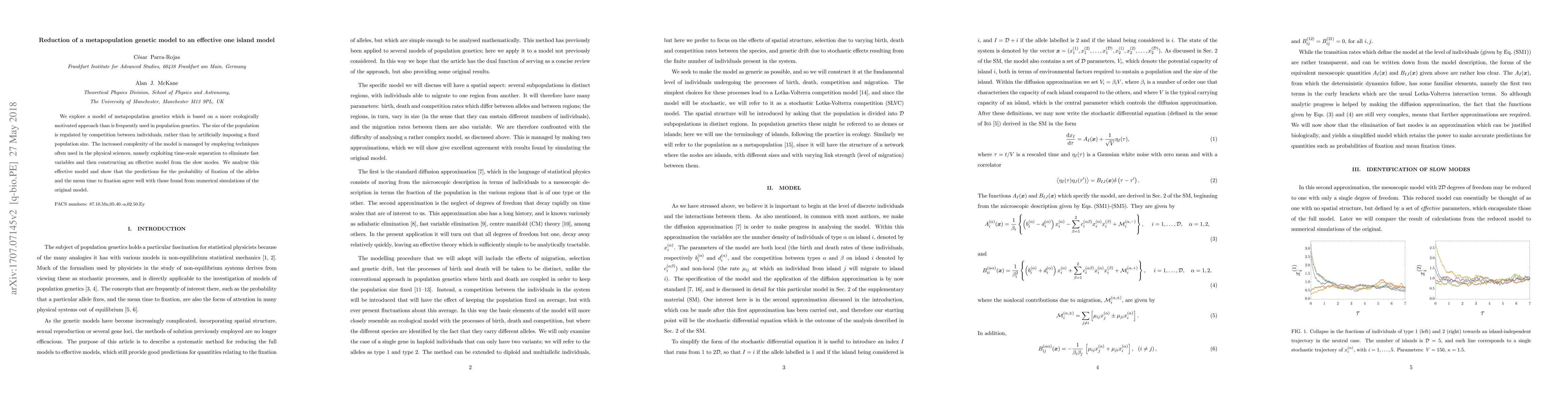 We explore a model of metapopulation genetics which is based on a more ecologically motivated approach than is frequently used in population genetics. The size of the population is regulated by competition between individuals, rather than by artificially imposing a fixed population size. The increased complexity of the model is managed by employing techniques often used in the physical sciences, namely exploiting time-scale separation to eliminate fast variables and then constructing an effective model from the slow modes. Remarkably, an initial model with 2$\mathcal{D}$ variables, where $\mathcal{D}$ is the number of islands in the metapopulation, can be reduced to a model with a single variable. We analyze this effective model and show that the predictions for the probability of fixation of the alleles and the mean time to fixation agree well with those found from numerical simulations of the original model.