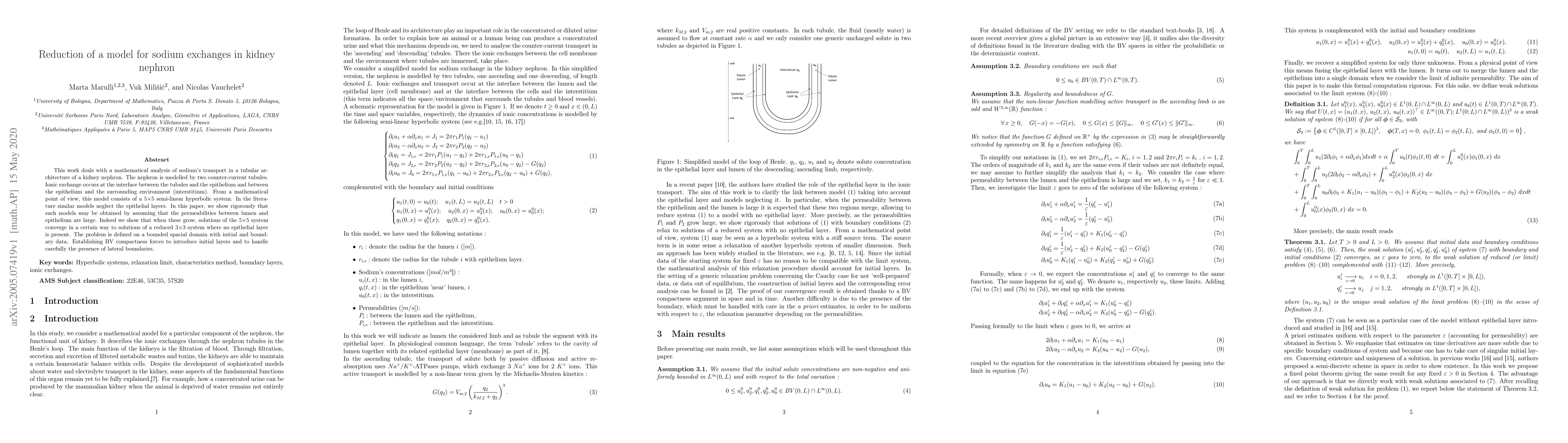 This work deals with a mathematical analysis of sodium's transport in a tubular architecture of a kidney nephron. The nephron is modelled by two counter-current tubules. Ionic exchange occurs at the interface between the tubules and the epithelium and between the epithelium and the surrounding environment (interstitium). From a mathematical point of view, this model consists of a 5x5 semi-linear hyperbolic system. In the literature similar models neglect the epithelial layers. In this paper, we show rigorously that such models may be obtained by assuming that the permeabilities between lumen and epithelium are large. Indeed we show that when these grow, solutions of the 5x5 system converge in a certain way to solutions of a reduced 3x3 system where no epithelial layer is present. The problem is dened on a bounded spacial domain with initial and boundary data. Establishing BV compactness forces to introduce initial layers and to handle carefully the presence of lateral boundaries.