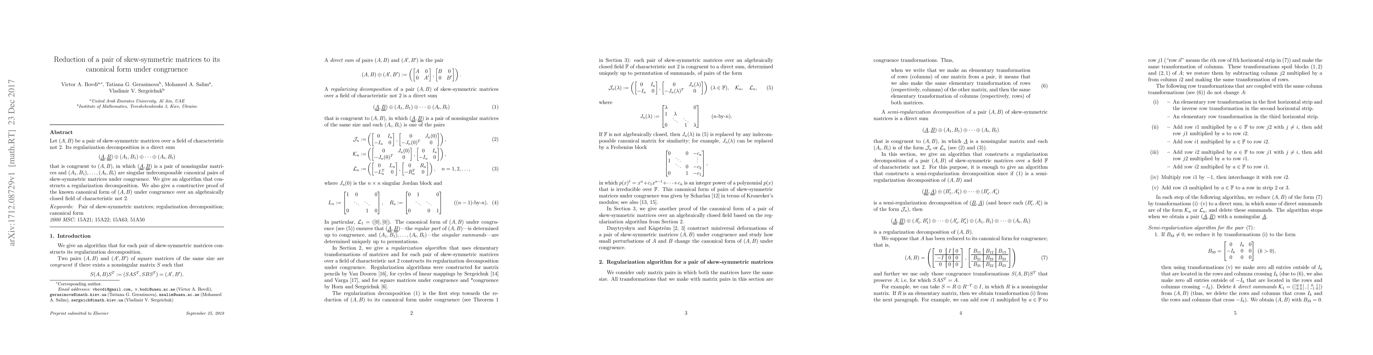 Let $(A,B)$ be a pair of skew-symmetric matrices over a field of characteristic not 2. Its regularization decomposition is a direct sum \[ (\underline{\underline A},\underline{\underline B})\oplus (A_1,B_1)\oplus\dots\oplus(A_t,B_t) \] that is congruent to $(A,B)$, in which $(\underline{\underline A},\underline{\underline B})$ is a pair of nonsingular matrices and $(A_1,B_1),$ $\dots,$ $(A_t,B_t)$ are singular indecomposable canonical pairs of skew-symmetric matrices under congruence. We give an algorithm that constructs a regularization decomposition. We also give a constructive proof of the known canonical form of $(A,B)$ under congruence over an algebraically closed field of characteristic not 2.