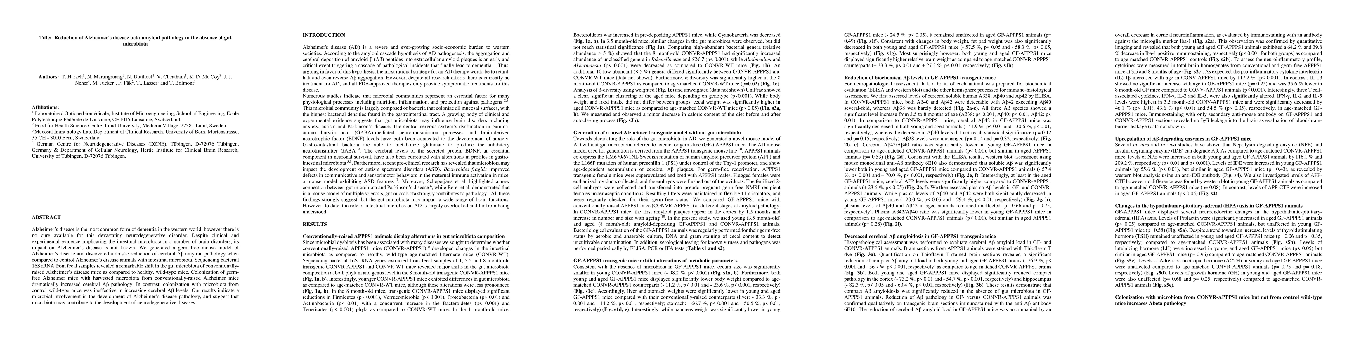 This study demonstrates that Alzheimer's disease beta-amyloid pathology is significantly reduced in germ-free mice, indicating a role of gut microbiota in its development. Transferring microbiota from conventionally-raised Alzheimer's mice to germ-free mice increased amyloid pathology, suggesting gut microbiota may contribute to neurodegenerative diseases.