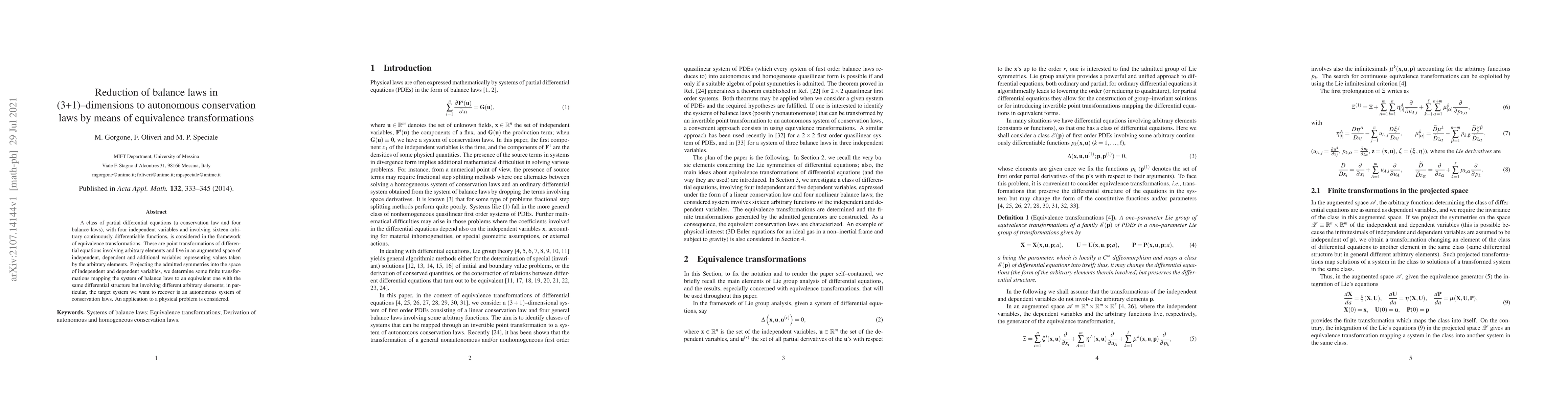 A class of partial differential equations (a conservation law and four balance laws), with four independent variables and involving sixteen arbitrary continuously differentiable functions, is considered in the framework of equivalence transformations. These are point transformations of differential equations involving arbitrary elements and live in an augmented space of independent, dependent and additional variables representing values taken by the arbitrary elements. Projecting the admitted symmetries into the space of independent and dependent variables, we determine some finite transformations mapping the system of balance laws to an equivalent one with the same differential structure but involving different arbitrary elements; in particular, the target system we want to recover is an autonomous system of conservation laws. An application to a physical problem is considered.