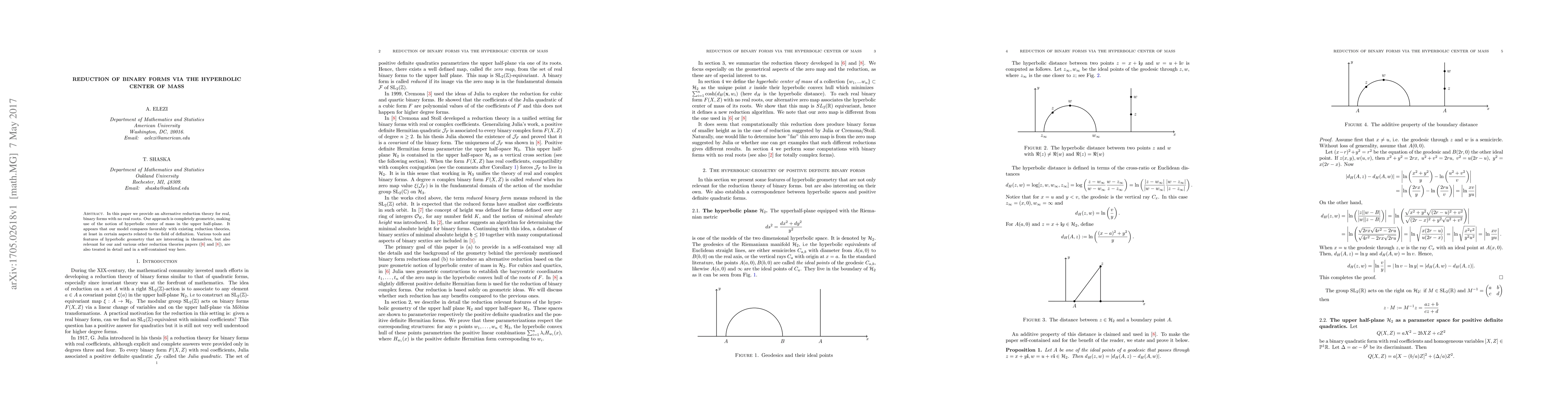 In this paper we provide an alternative reduction theory for real, binary forms with no real roots. Our approach is completely geometric, making use of the notion of hyperbolic center of mass in the upper half-plane. It appears that our model compares favorably with existing reduction theories, at least in certain aspects related to the field of definition. Various tools and features of hyperbolic geometry that are interesting in themselves, but also relevant for our and various other reduction theories papers (\cite{julia} and \cite{SC}), are also treated in detail and in a self-contained way here.