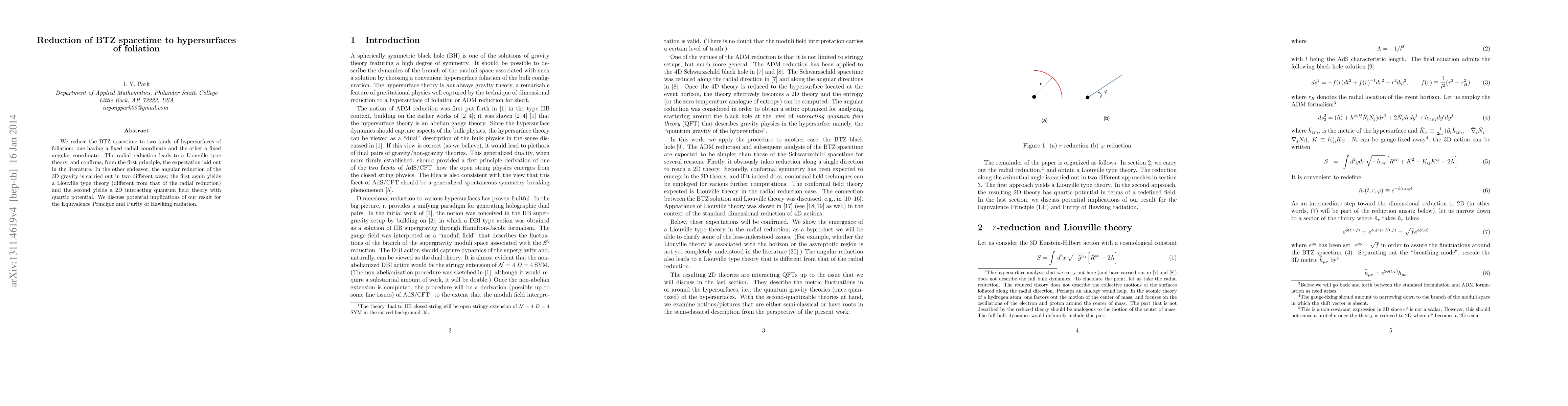 This paper reduces the BTZ spacetime to hypersurfaces of foliation, revealing a Liouville type theory from radial reduction and distinct Liouville and quartic potential theories from angular reduction. Implications for the Equivalence Principle and purity of Hawking radiation are discussed.