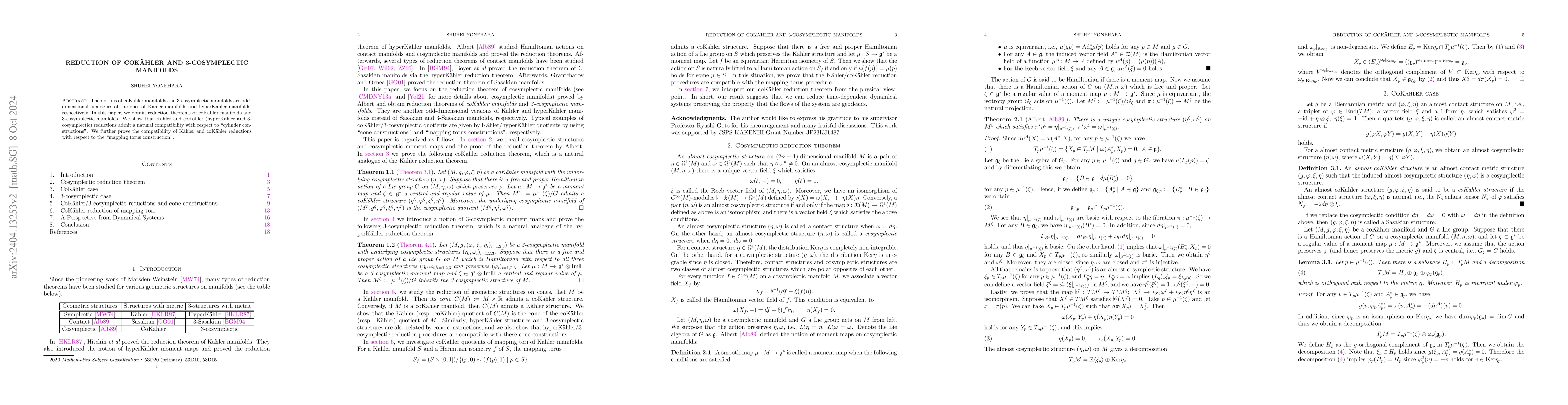 This paper establishes reduction theorems for coKähler and 3-cosymplectic manifolds, showing compatibility between Kähler and coKähler reductions in cone constructions and mapping torus constructions, and extending the compatibility to hyperKähler and 3-cosymplectic reductions.