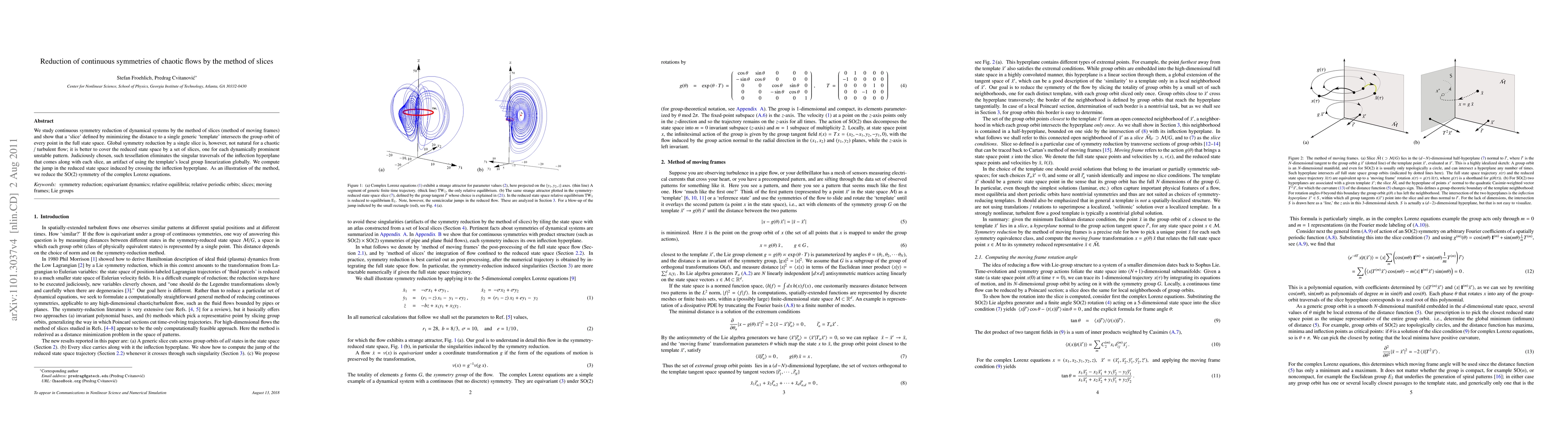 This paper explores the continuous symmetry reduction of chaotic dynamical systems using the method of slices, demonstrating that multiple slices, each corresponding to a prominent unstable pattern, are necessary to effectively reduce the state space and avoid singular traversals. The method is illustrated by reducing the SO(2) symmetry in the complex Lorenz equations.