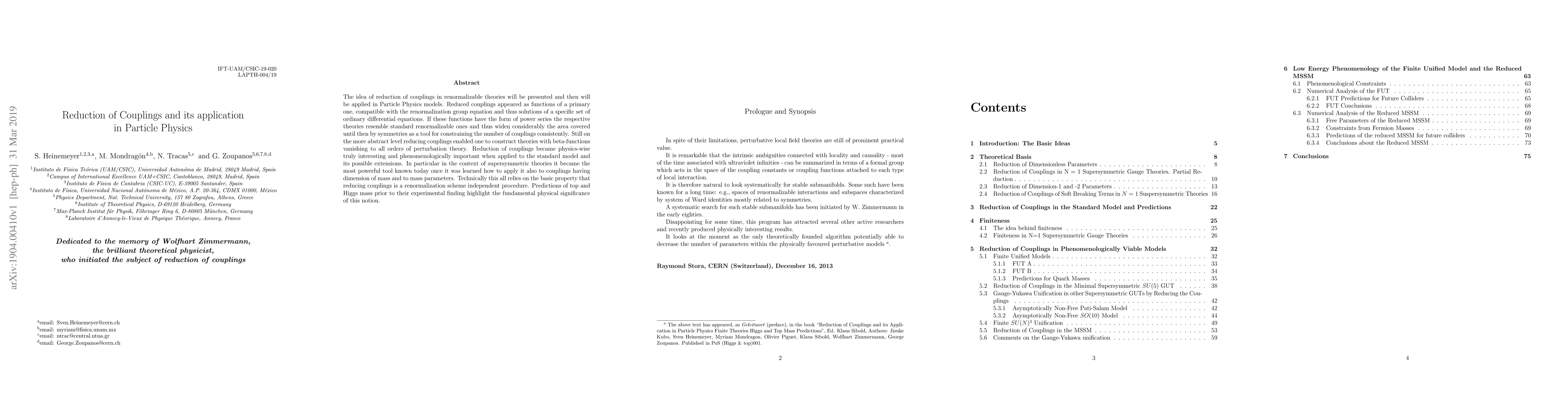 The idea of reduction of couplings in renormalizable theories will be presented and then will be applied in Particle Physics models. Reduced couplings appeared as functions of a primary one, compatible with the renormalization group equation and thus solutions of a specific set of ordinary differential equations. If these functions have the form of power series the respective theories resemble standard renormalizable ones and thus widen considerably the area covered until then by symmetries as a tool for constraining the number of couplings consistently. Still on the more abstract level reducing couplings enabled one to construct theories with beta-functions vanishing to all orders of perturbation theory. Reduction of couplings became physics-wise truly interesting and phenomenologically important when applied to the standard model and its possible extensions. In particular in the context of supersymmetric theories it became the most powerful tool known today once it was learned how to apply it also to couplings having dimension of mass and to mass parameters. Technically this all relies on the basic property that reducing couplings is a renormalization scheme independent procedure. Predictions of top and Higgs mass prior to their experimental finding highlight the fundamental physical significance of this notion.