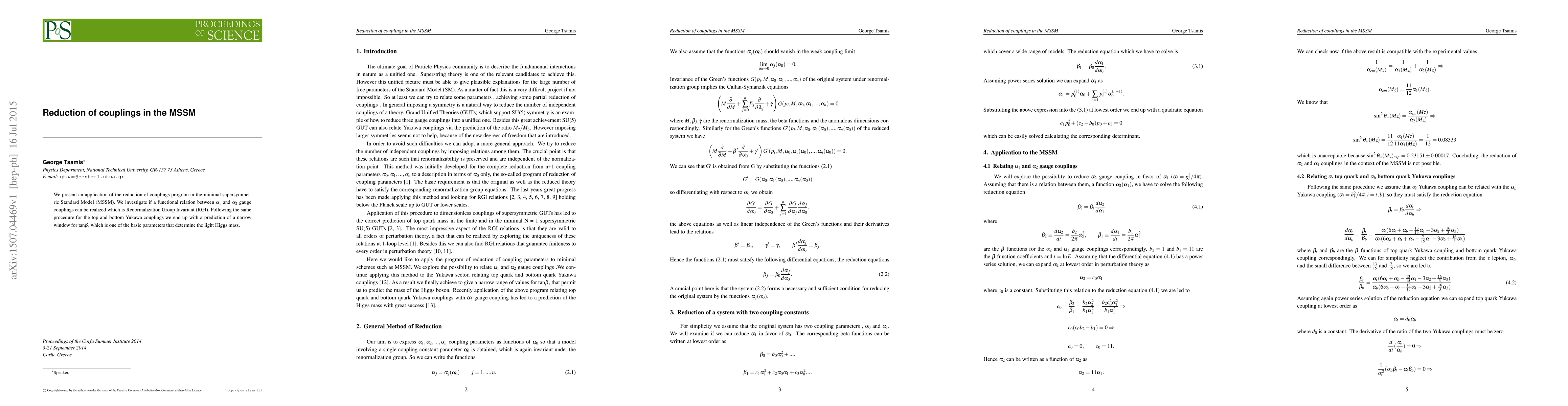 We present an application of the reduction of couplings program in the minimal supersymmetric Standard Model (MSSM). We investigate if a functional relation between $\alpha_1$ and $\alpha_2$ gauge couplings can be realized which is Renormalization Group Invariant (RGI). Following the same procedure for the top and bottom Yukawa couplings we end up with a prediction of a narrow window for tan$\beta$, which is one of the basic parameters that determine the light Higgs mass.