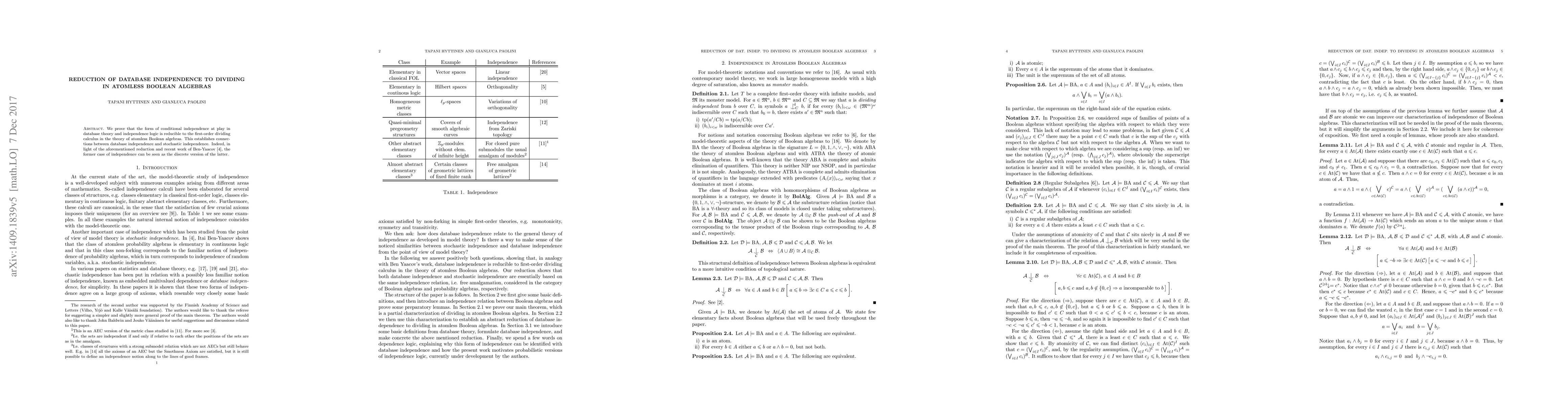 The paper proves that conditional independence in database theory is reducible to the first-order dividing calculus in the theory of atomless Boolean algebras, establishing connections with stochastic independence.