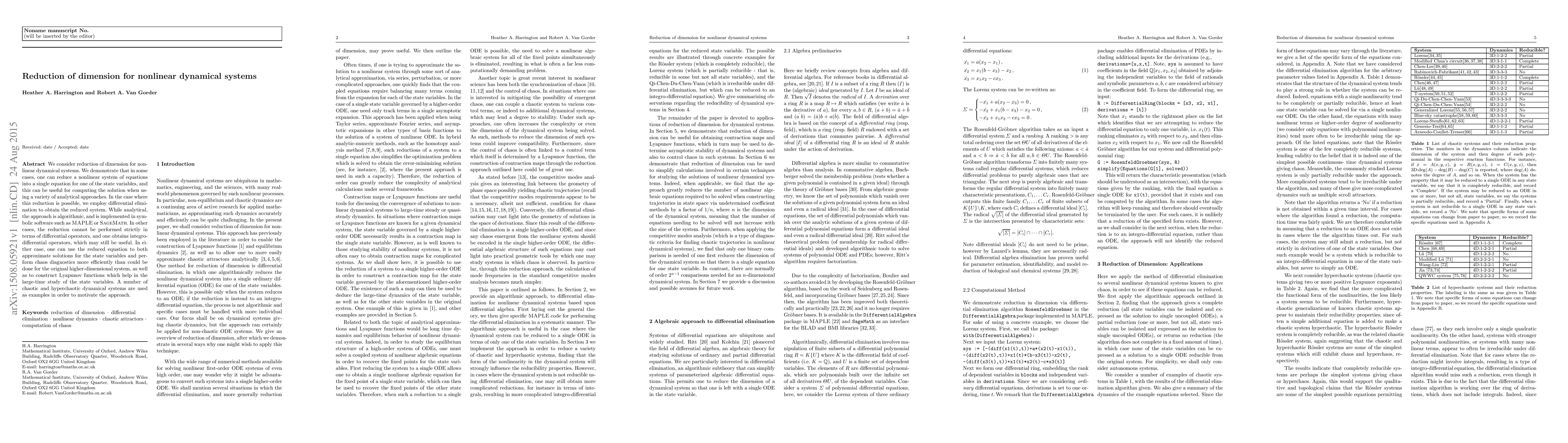 We consider reduction of dimension for nonlinear dynamical systems. We demonstrate that in some cases, one can reduce a nonlinear system of equations into a single equation for one of the state variables, and this can be useful for computing the solution when using a variety of analytical approaches. In the case where this reduction is possible, we employ differential elimination to obtain the reduced system. While analytical, the approach is algorithmic, and is implemented in symbolic software such as {\sc MAPLE} or {\sc SageMath}. In other cases, the reduction cannot be performed strictly in terms of differential operators, and one obtains integro-differential operators, which may still be useful. In either case, one can use the reduced equation to both approximate solutions for the state variables and perform chaos diagnostics more efficiently than could be done for the original higher-dimensional system, as well as to construct Lyapunov functions which help in the large-time study of the state variables. A number of chaotic and hyperchaotic dynamical systems are used as examples in order to motivate the approach.