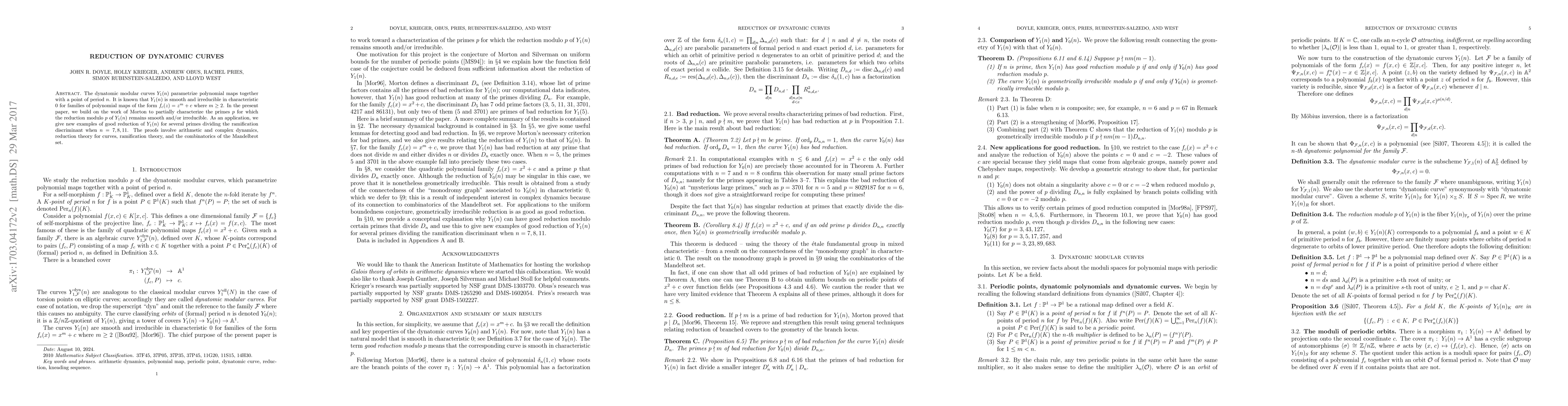 The dynatomic modular curves parametrize polynomial maps together with a point of period $n$. It is known that the dynatomic curves $Y_1(n)$ are smooth and irreducible in characteristic 0 for families of polynomial maps of the form $f_c(z) = z^m +c$ where $m\geq 2$. In the present paper, we build on the work of Morton to partially characterize the primes $p$ for which the reduction modulo $p$ of $Y_1(n)$ remains smooth and/or irreducible. As an application, we give new examples of good reduction of $Y_1(n)$ for several primes dividing the ramification discriminant when $n=7,8,11$. The proofs involve arithmetic and complex dynamics, reduction theory for curves, ramification theory, and the combinatorics of the Mandelbrot set.