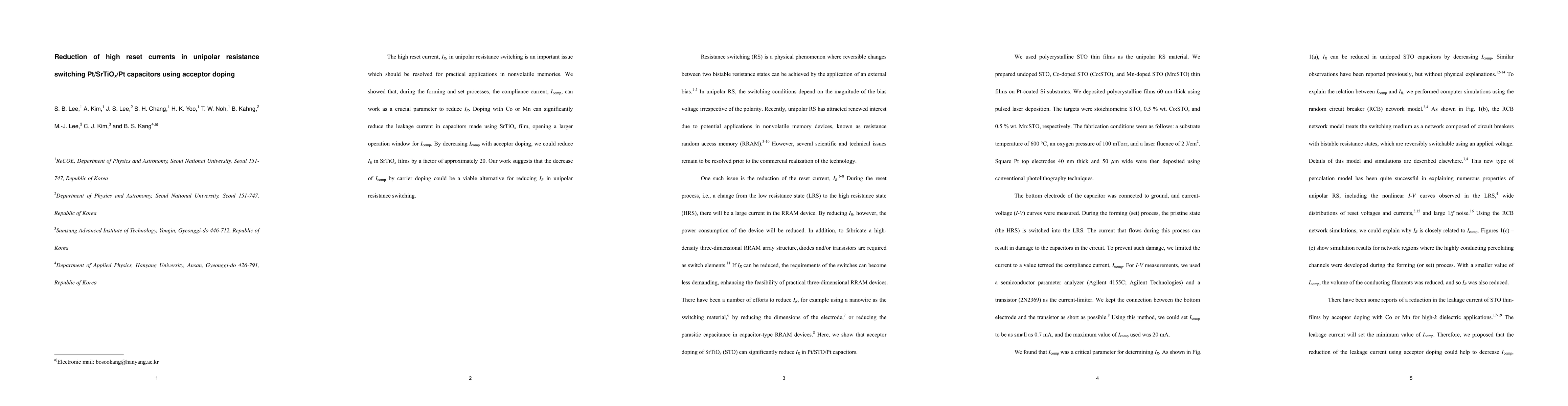 This paper demonstrates that acceptor doping with Co or Mn can significantly reduce reset currents in unipolar resistance switching in Pt/SrTiOx/Pt capacitors, achieving a reduction by a factor of approximately 20. The use of compliance current as a parameter during forming and set processes is highlighted as a viable method for practical nonvolatile memory applications.