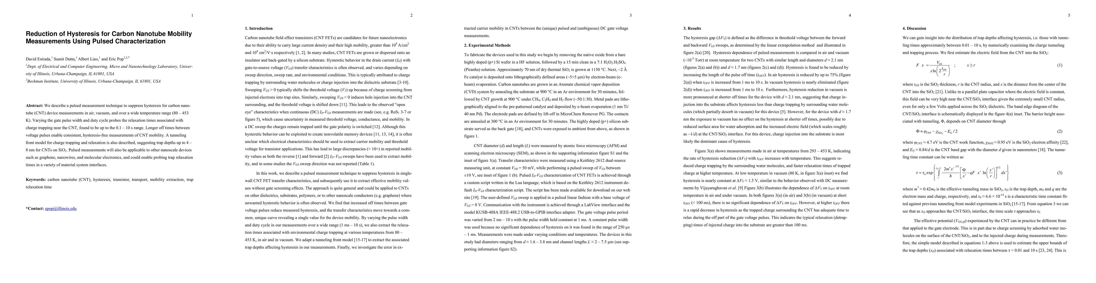 We describe a pulsed measurement technique to suppress hysteresis for carbon nanotube (CNT) device measurements in air, vacuum, and over a wide temperature range (80-453 K). Varying the gate pulse width and duty cycle probes the relaxation times associated with charge trapping near the CNT, found to be up to the 0.1-10 s range. Longer off times between voltage pulses enable consistent, hysteresis-free measurements of CNT mobility. A tunneling front model for charge trapping and relaxation is also described, suggesting trap depths up to 4-8 nm for CNTs on SiO2. Pulsed measurements will also be applicable to other nanoscale devices such as graphene, nanowires, and molecular electronics, and could enable probing trap relaxation times in a variety of material system interfaces.