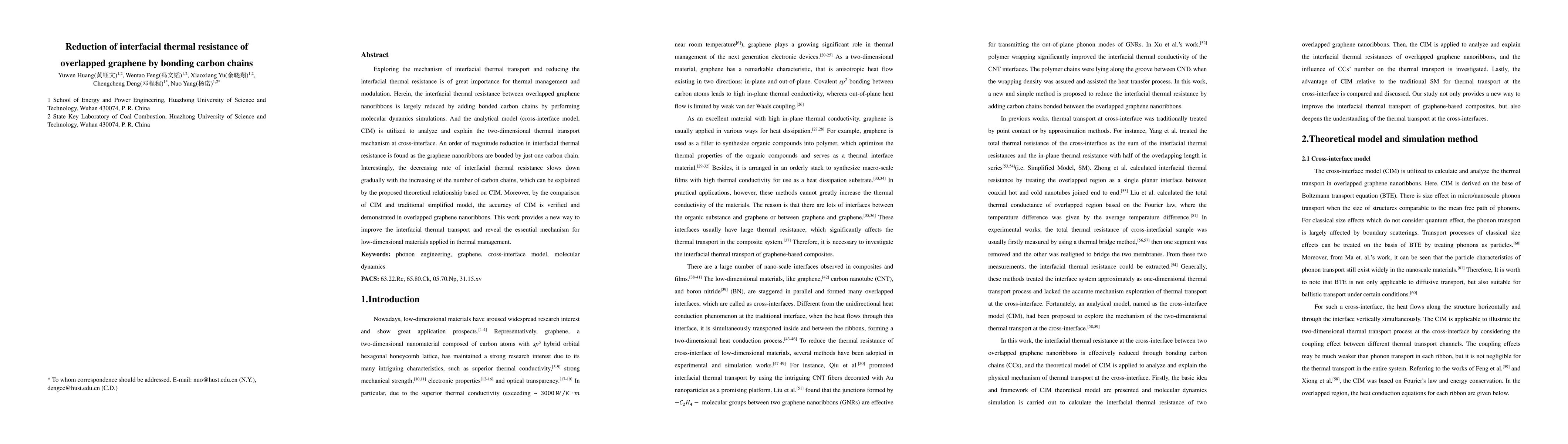 This paper explores the reduction of interfacial thermal resistance between overlapped graphene nanoribbons by bonding carbon chains, achieving an order of magnitude decrease using molecular dynamics simulations. The cross-interface model (CIM) is utilized to analyze the thermal transport mechanism, revealing a slowing rate of resistance reduction with more carbon chains.