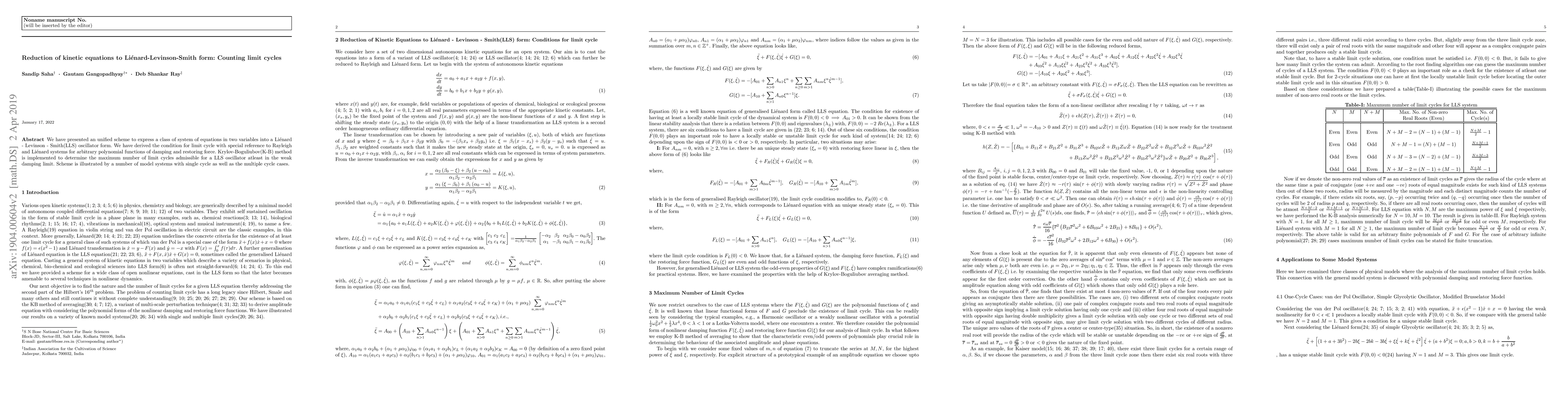 This paper presents a unified method to convert systems of kinetic equations into Li\'enard-Levinson-Smith (LLS) oscillator form, deriving conditions for limit cycles in Rayleigh and Li\'enard systems. The Krylov-Boguliubov method is used to determine the maximum number of limit cycles in the weak damping limit, illustrated through various model systems.