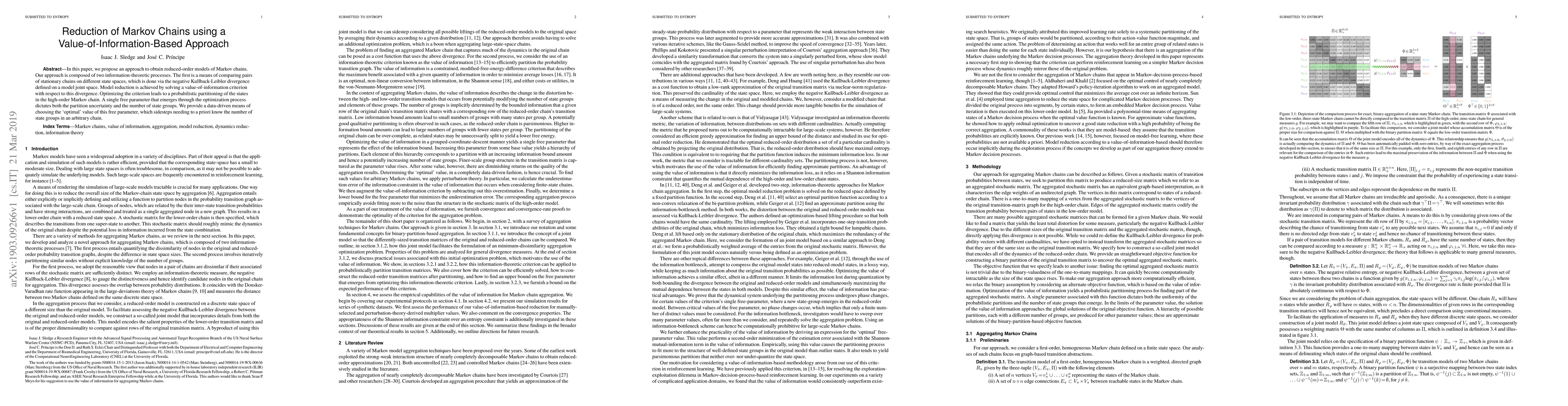 This paper proposes a value-of-information-based method for reducing Markov chains by optimizing a probabilistic partitioning of states using Kullback-Leibler divergence. A single parameter determines both partition uncertainty and the number of state groups, with an optimal value chosen data-driven.