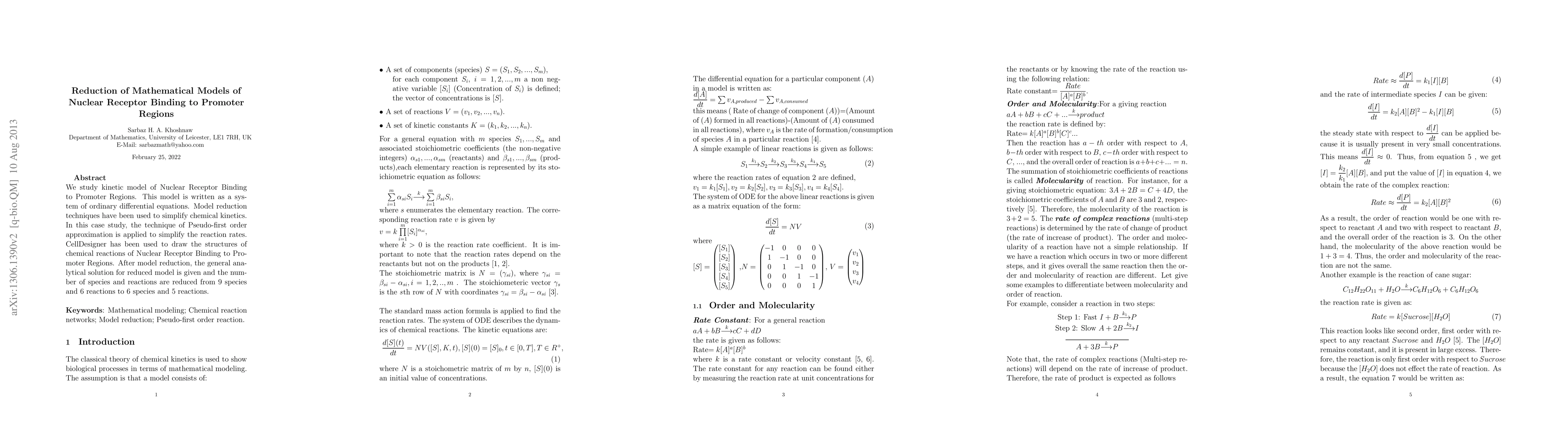 Researchers simplified a complex model of nuclear receptor binding to promoter regions using Pseudo-first order approximation, reducing it from 9 species and 6 reactions to 6 species and 5 reactions.