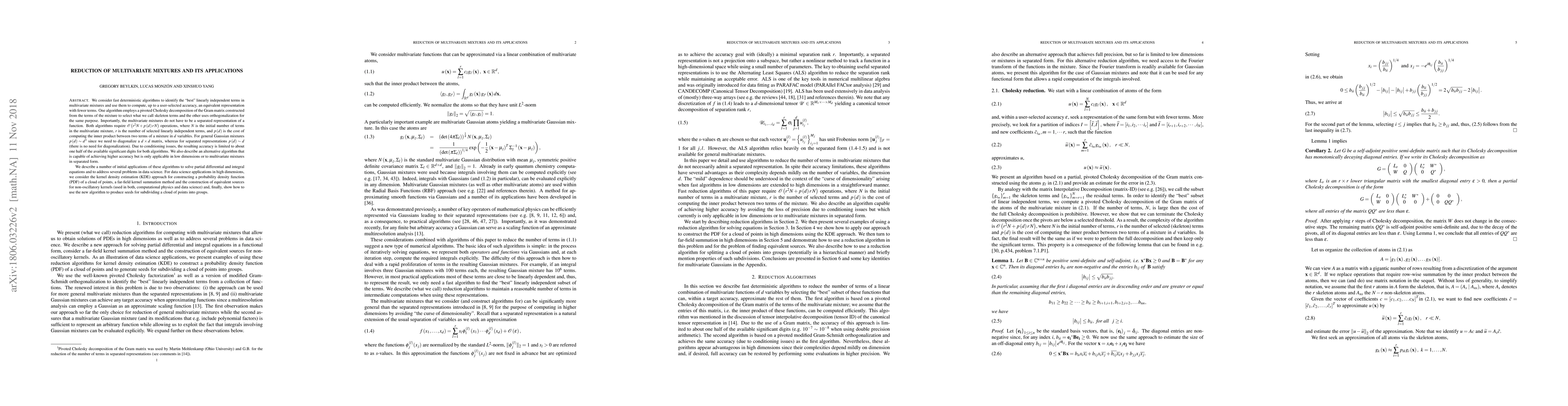This paper presents two fast deterministic algorithms for reducing multivariate mixtures to fewer linearly independent terms, employing pivoted Cholesky decomposition and orthogonalization. The algorithms are applied to partial differential equations, integral equations, and data science tasks like kernel density estimation and clustering. Despite computational efficiency, the algorithms' accuracy is limited due to conditioning issues.