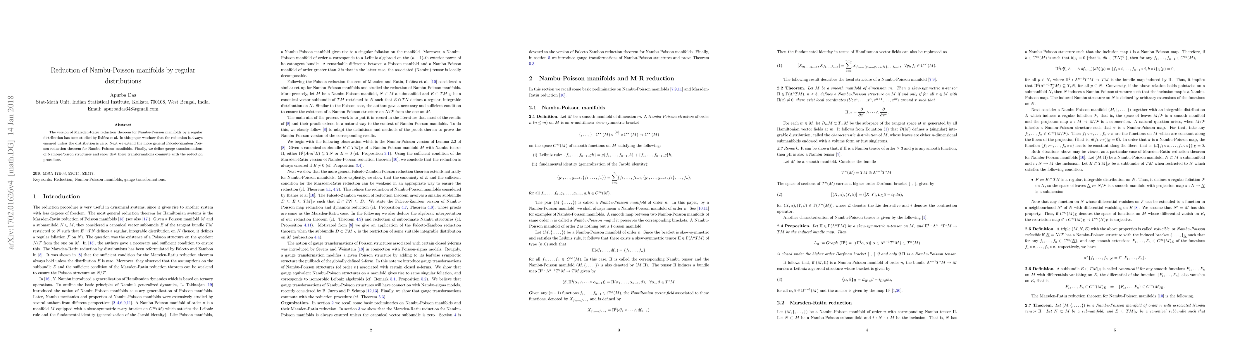 This paper investigates the reduction of Nambu-Poisson manifolds via regular distributions, confirming reduction unless the distribution is zero. It extends the Falceto-Zambon Poisson reduction theorem and demonstrates that gauge transformations of Nambu-Poisson structures commute with the reduction process.