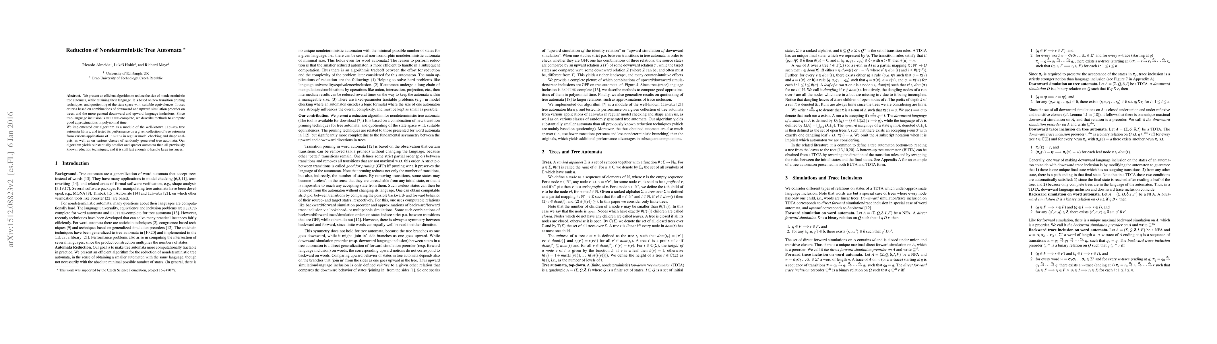 The paper proposes an efficient algorithm for reducing the size of nondeterministic tree automata while preserving their language, employing transition pruning and quotienting based on simulation preorders. The algorithm performs well on real and random instances, producing smaller automata compared to previous methods.