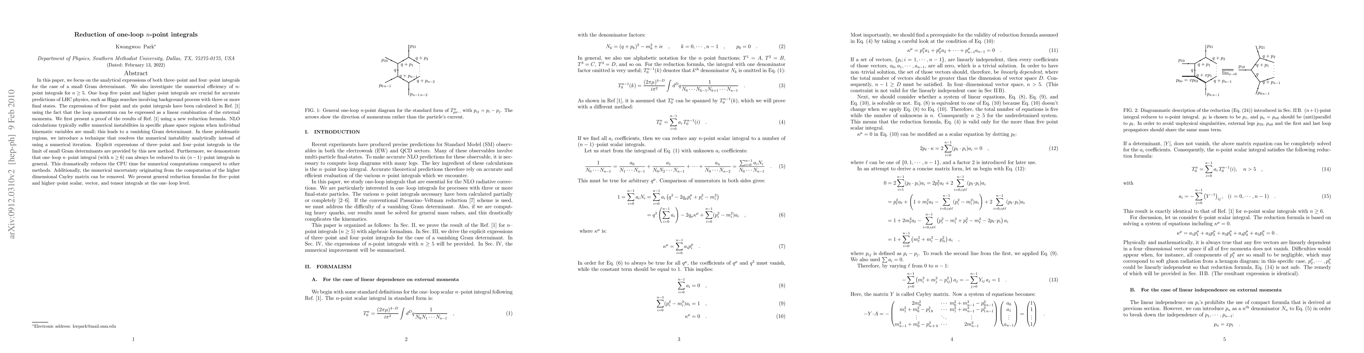 This paper presents analytical expressions for three and four-point one-loop integrals under small Gram determinant conditions and a method to numerically reduce $n$-point integrals ($n\ge5$) to five $(n-1)$-point integrals, significantly improving computational efficiency.