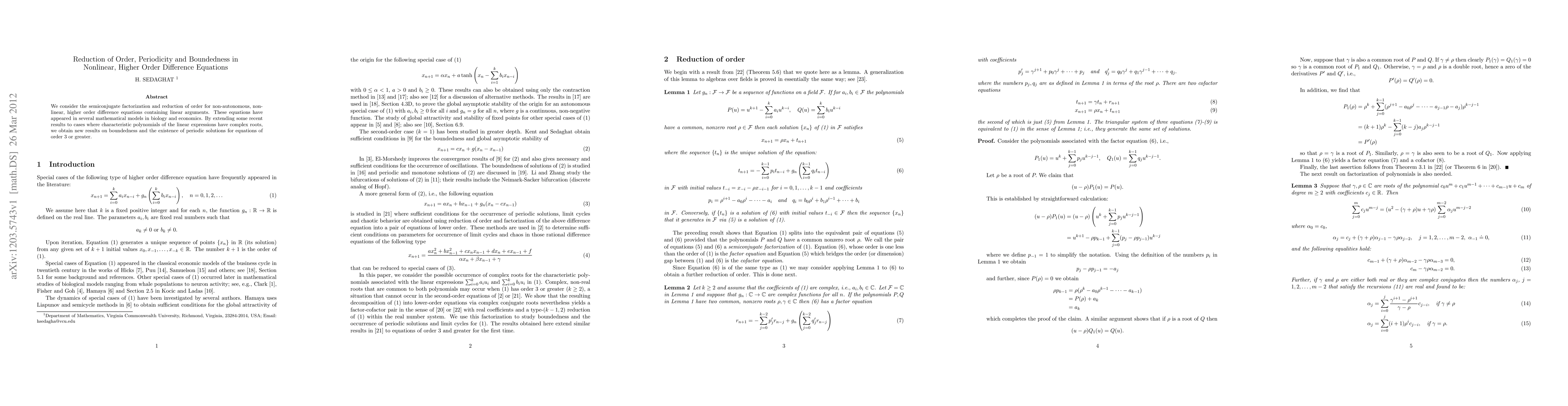 This paper explores semiconjugate factorization and reduction of order for nonlinear, higher-order difference equations, extending recent results to include complex roots in characteristic polynomials. It provides new insights into boundedness and periodic solution existence for equations of order three or higher, relevant to models in biology and economics.