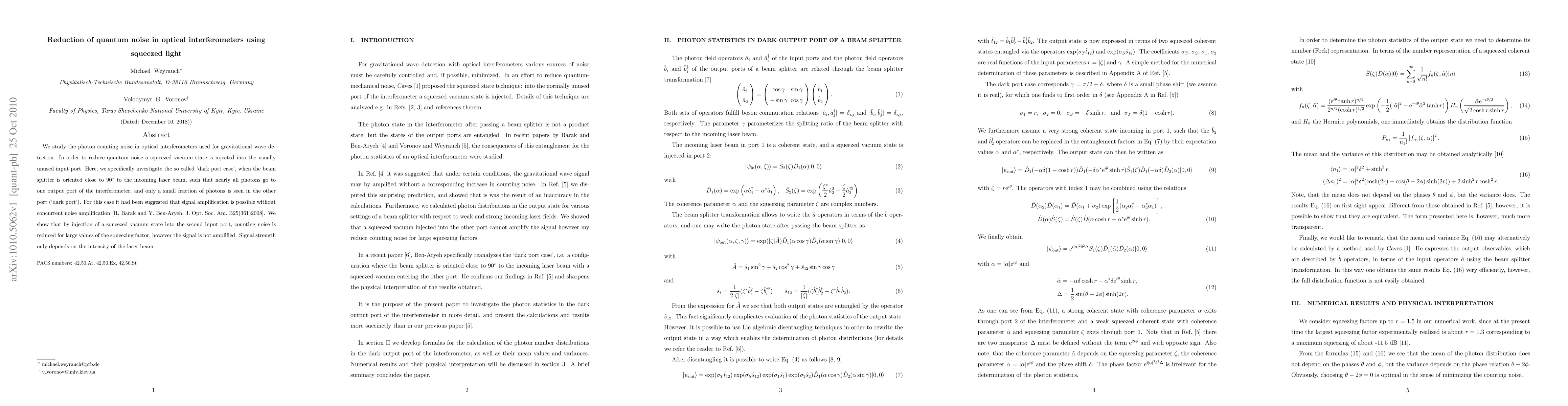 This paper investigates the reduction of photon counting noise in optical interferometers for gravitational wave detection by using squeezed vacuum states. It demonstrates that injecting squeezed light into the "dark port" can significantly reduce counting noise without amplifying the signal, thus improving the sensitivity of the interferometers.