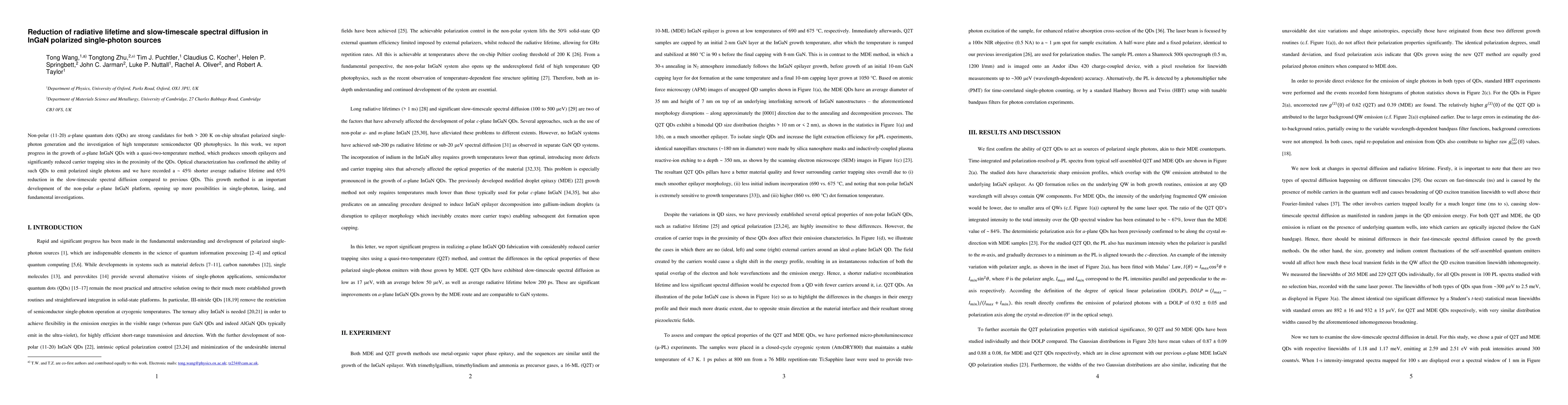 This paper reports the successful growth of a-plane InGaN quantum dots using a quasi-two-temperature method, which significantly reduces radiative lifetime and slow-timescale spectral diffusion. The new method produces smooth epilayers and fewer trapping sites, leading to a 45% shorter average radiative lifetime and a 65% reduction in spectral diffusion compared to previous methods.