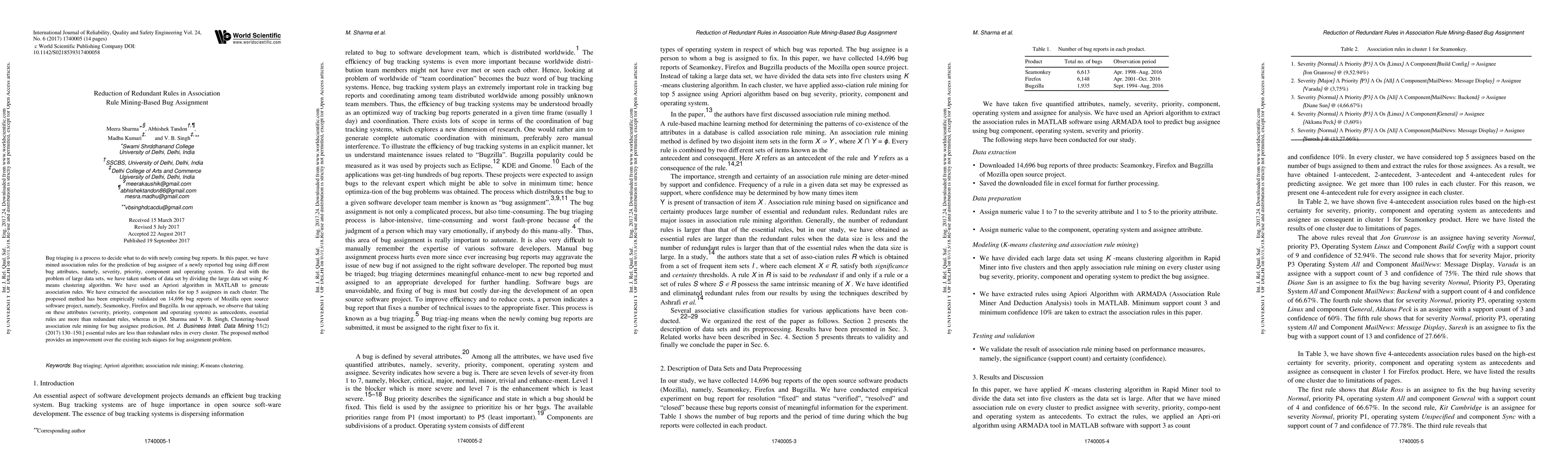 This paper proposes a method to predict bug assignees using association rule mining, addressing large datasets by clustering with K-means and extracting rules with Apriori. The approach improves bug assignment prediction over existing techniques, validated on 14696 bug reports from Mozilla's Seamonkey, Firefox, and Bugzilla projects.