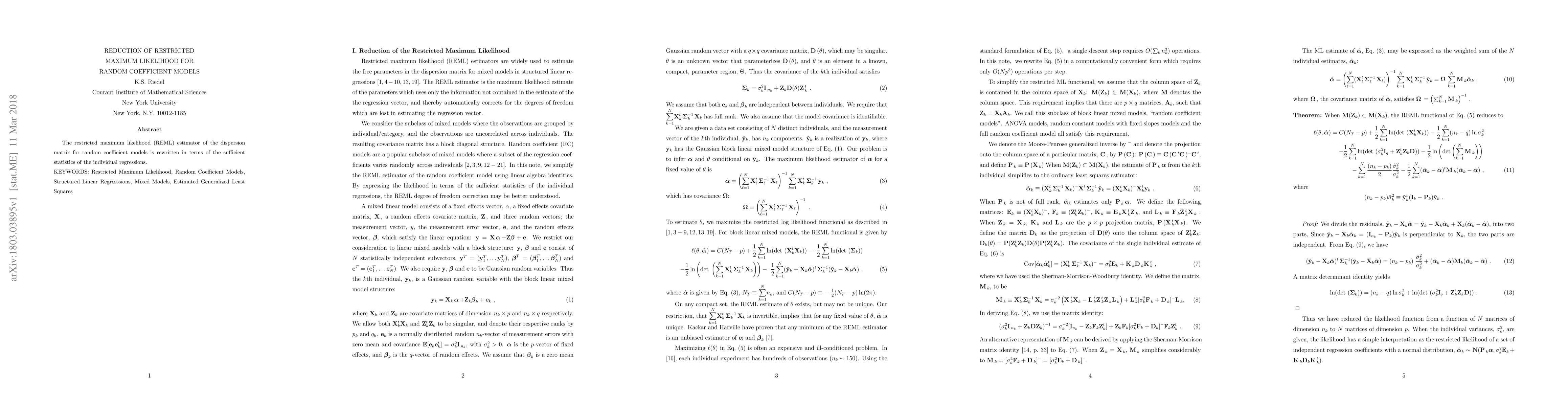 The restricted maximum likelihood (REML) estimator of the dispersion matrix for random coefficient models is rewritten in terms of the sufficient statistics of the individual regressions.