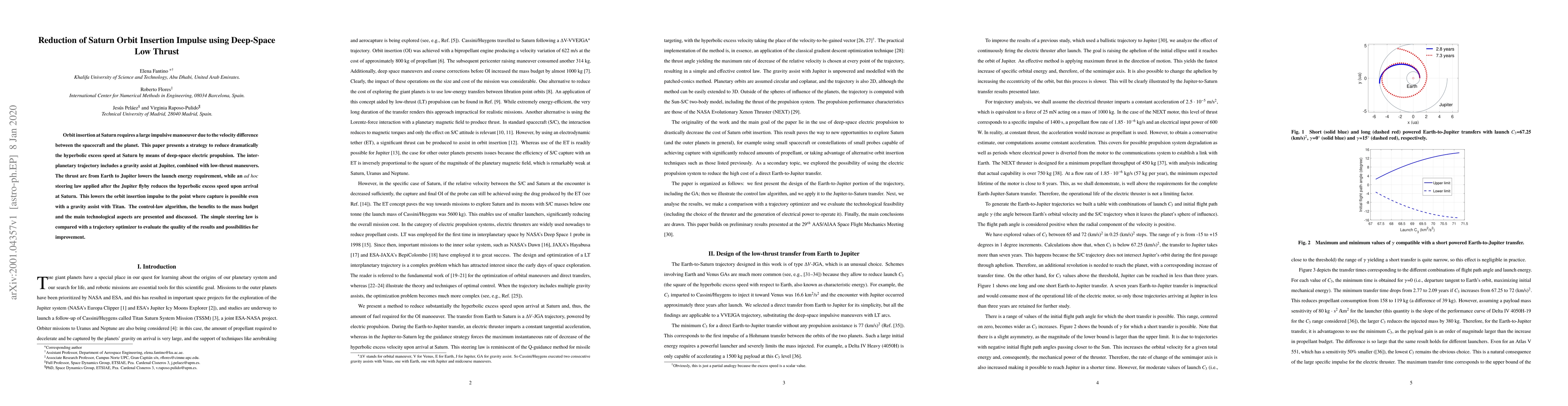 Orbit insertion at Saturn requires a large impulsive manoeuver due to the velocity difference between the spacecraft and the planet. This paper presents a strategy to reduce dramatically the hyperbolic excess speed at Saturn by means of deep-space electric propulsion. The interplanetary trajectory includes a gravity assist at Jupiter, combined with low-thrust maneuvers. The thrust arc from Earth to Jupiter lowers the launch energy requirement, while an ad hoc steering law applied after the Jupiter flyby reduces the hyperbolic excess speed upon arrival at Saturn. This lowers the orbit insertion impulse to the point where capture is possible even with a gravity assist with Titan. The control-law algorithm, the benefits to the mass budget and the main technological aspects are presented and discussed. The simple steering law is compared with a trajectory optimizer to evaluate the quality of the results and possibilities for improvement.