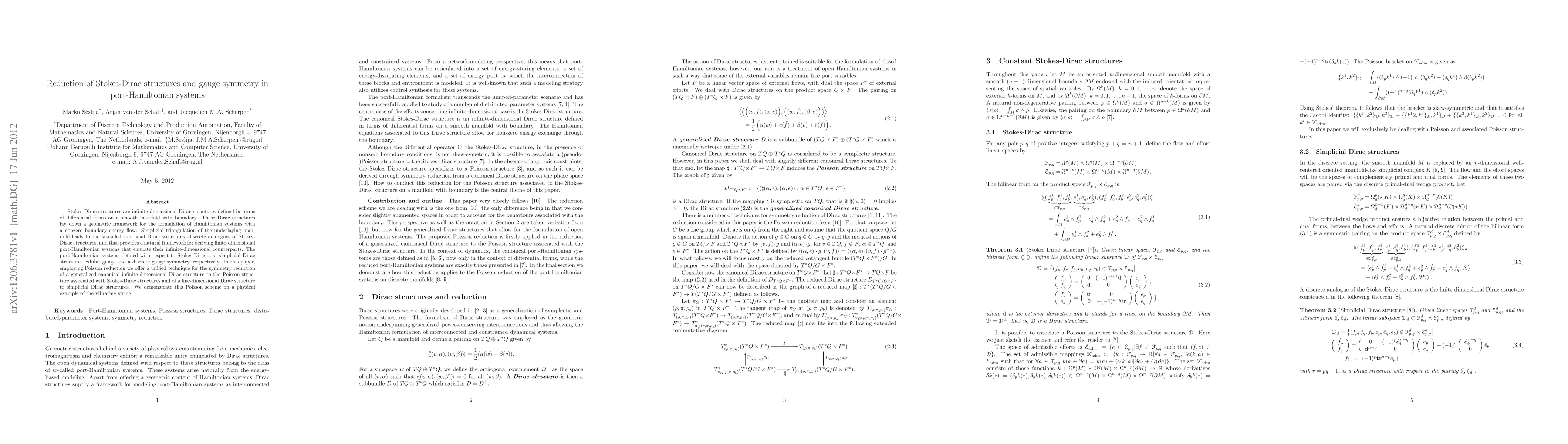 This paper presents a method for reducing Stokes-Dirac structures and gauge symmetries in port-Hamiltonian systems through Poisson reduction. It demonstrates the technique on a vibrating string to show symmetry reduction from infinite-dimensional Dirac structures to finite-dimensional simplicial Dirac structures.