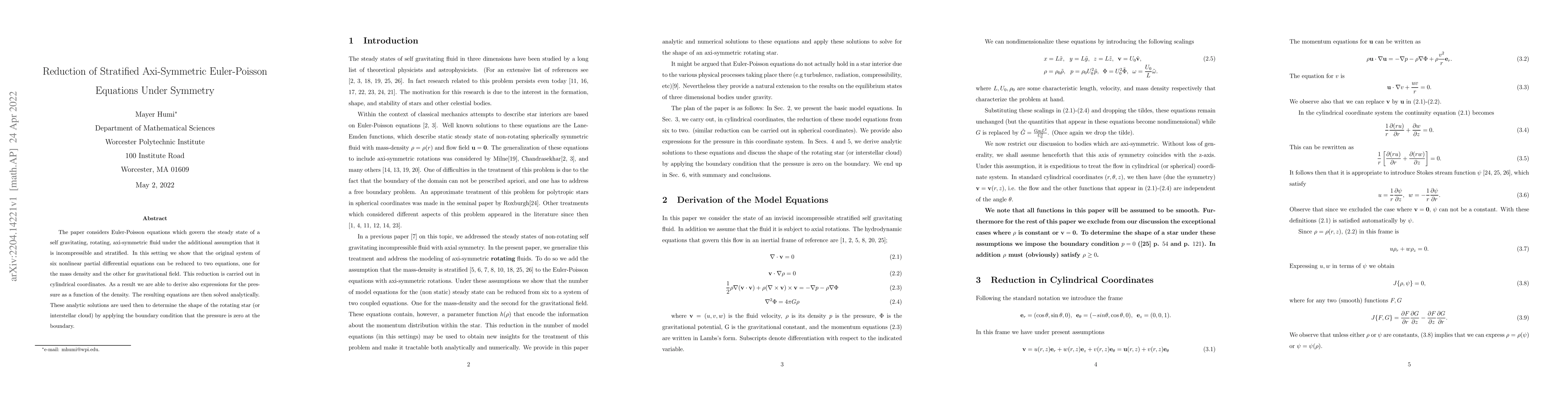 This paper reduces the six nonlinear partial differential equations of incompressible, stratified, axi-symmetric Euler-Poisson equations to two by leveraging cylindrical coordinates, deriving analytical solutions, and determining the shape of rotating stars or interstellar clouds where pressure is zero at the boundary.
