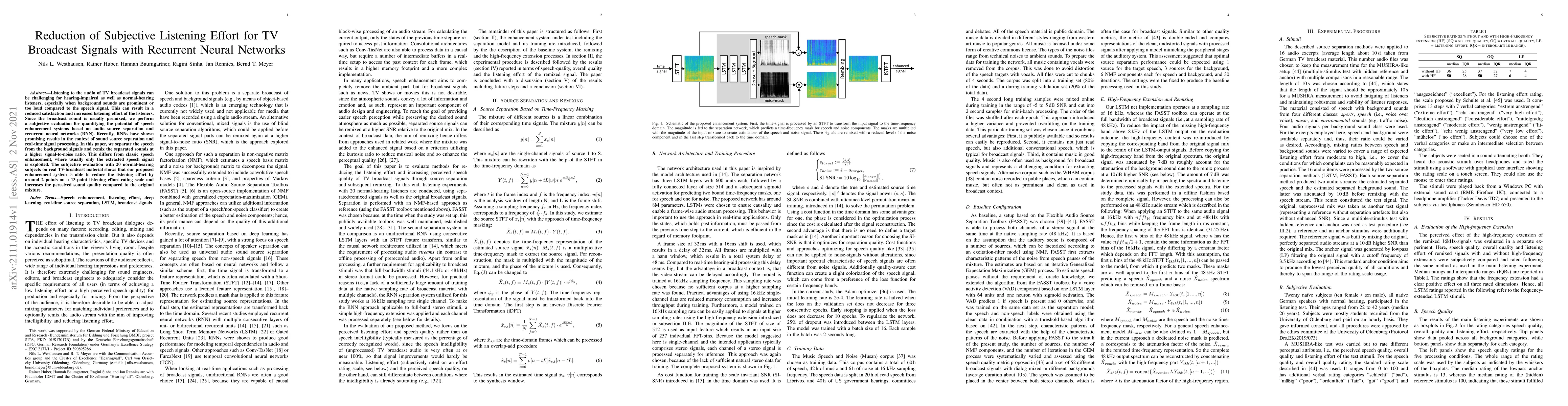A new system using recurrent neural networks reduces listening effort for TV broadcast signals, improving sound quality and satisfaction for both hearing-impaired and normal-hearing listeners.