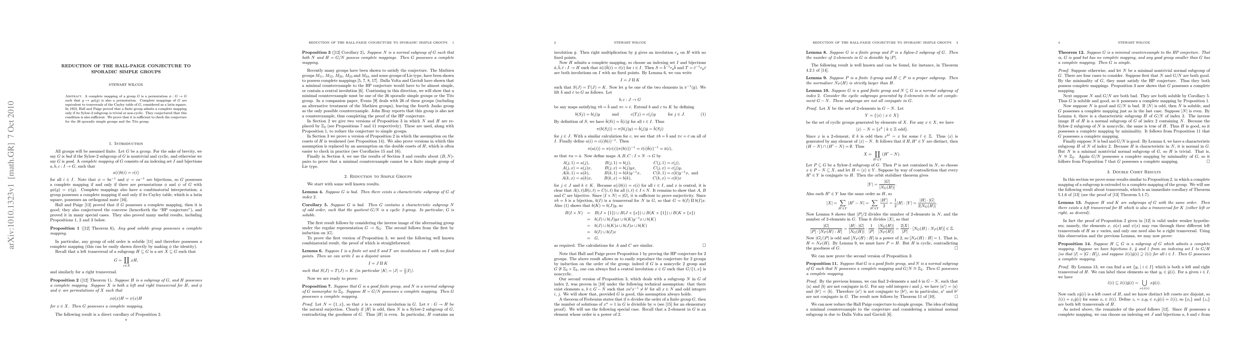 A complete mapping of a group $G$ is a permutation $\phi:G\rightarrow G$ such that $g\mapsto g\phi(g)$ is also a permutation. Complete mappings of $G$ are equivalent to tranversals of the Cayley table of $G$, considered as a latin square. In 1953, Hall and Paige proved that a finite group admits a complete mapping only if its Sylow-2 subgroup is trivial or non-cyclic. They conjectured that this condition is also sufficient. We prove that it is sufficient to check the conjecture for the 26 sporadic simple groups and the Tits group.