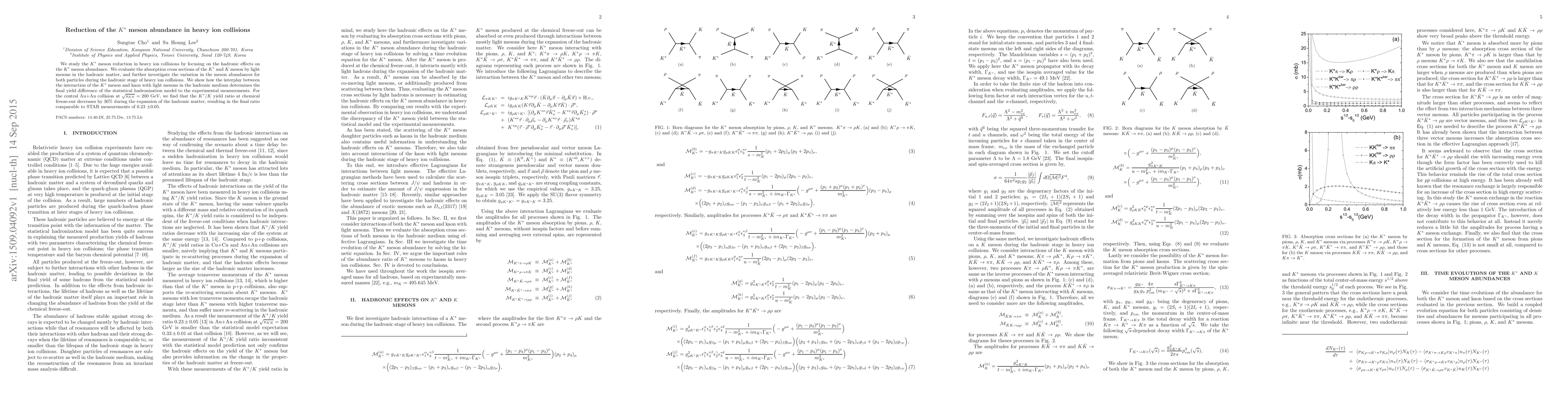 This paper investigates the reduction of $K^*$ meson abundance in heavy ion collisions, attributing it to hadronic effects and the absorption cross sections of $K^*$ and $K$ mesons by light mesons. The study finds a $36\%$ decrease in the $K^*/K$ yield ratio during the hadronic stage, aligning with STAR experimental measurements.