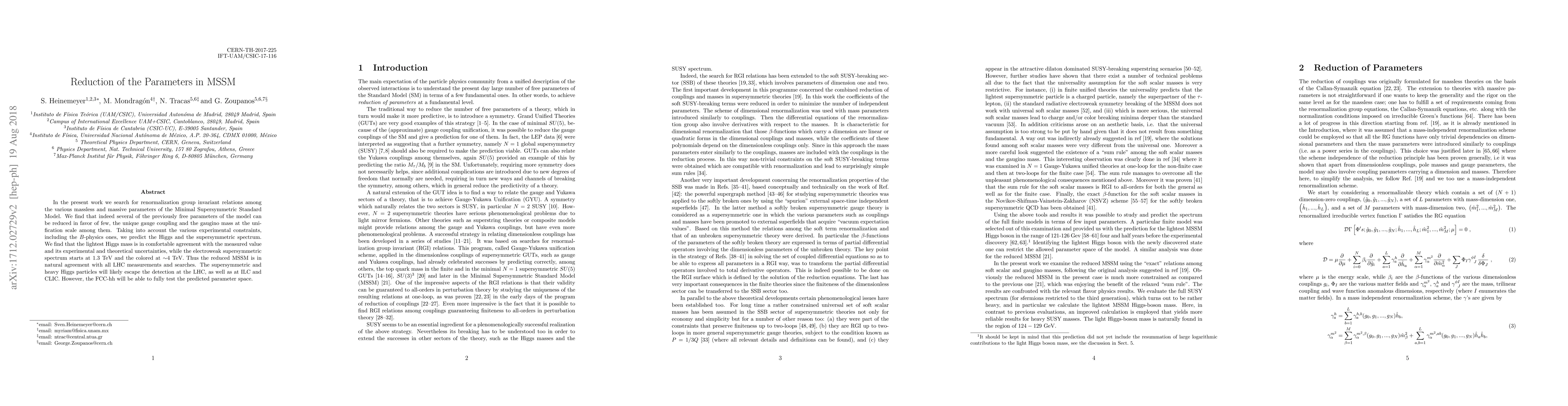 In the present work we search for renormalization group invariant relations among the various massless and massive parameters of the Minimal Supersymmetric Standard Model. We find that indeed several of the previously free parameters of the model can be reduced in favor of few, the unique gauge coupling and the gaugino mass at the unification scale among them. Taking into account the various experimental constraints, including the B-physics ones, we predict the Higgs and the supersymmetric spectrum. We find that the lightest Higgs mass is in comfortable agreement with the measured value and its experimental and theoretical uncertainties, while the electroweak supersymmetric spectrum starts at 1.3 TeV and the colored at ~4 TeV. Thus the reduced MSSM is in natural agreement with all LHC measurements and searches. The supersymmetric and heavy Higgs particles will likely escape the detection at the LHC, as well as at ILC and CLIC. However, the FCC-hh will be able to fully test the predicted parameter space.