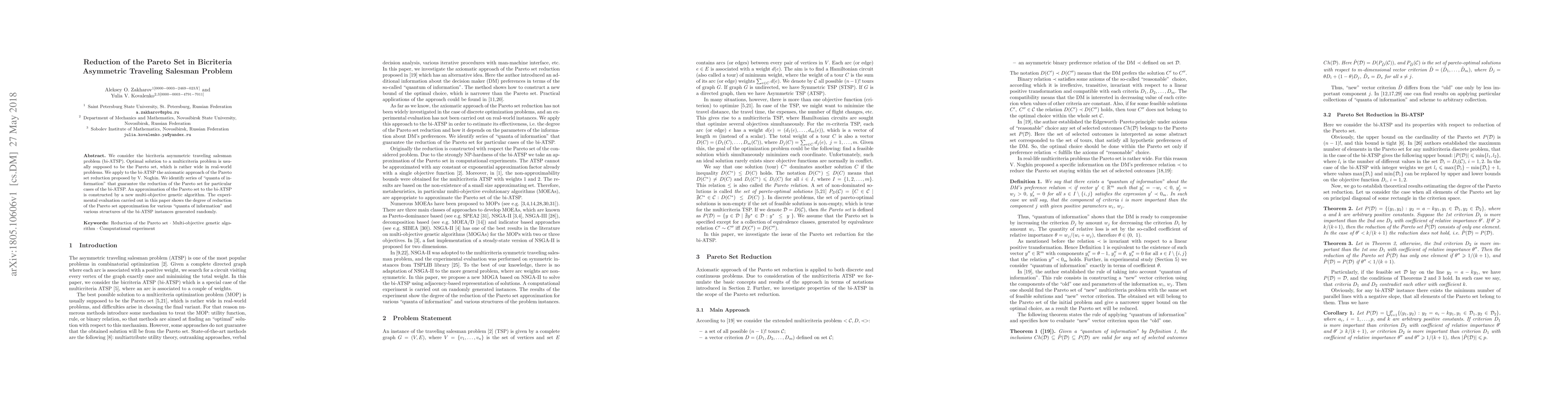 We consider the bicriteria asymmetric traveling salesman problem (bi-ATSP). Optimal solution to a multicriteria problem is usually supposed to be the Pareto set, which is rather wide in real-world problems. We apply to the bi-ATSP the axiomatic approach of the Pareto set reduction proposed by V. Noghin. We identify series of "quanta of information" that guarantee the reduction of the Pareto set for particular cases of the bi-ATSP. An approximation of the Pareto set to the bi-ATSP is constructed by a new multi-objective genetic algorithm. The experimental evaluation carried out in this paper shows the degree of reduction of the Pareto set approximation for various "quanta of information" and various structures of the bi-ATSP instances generated randomly.