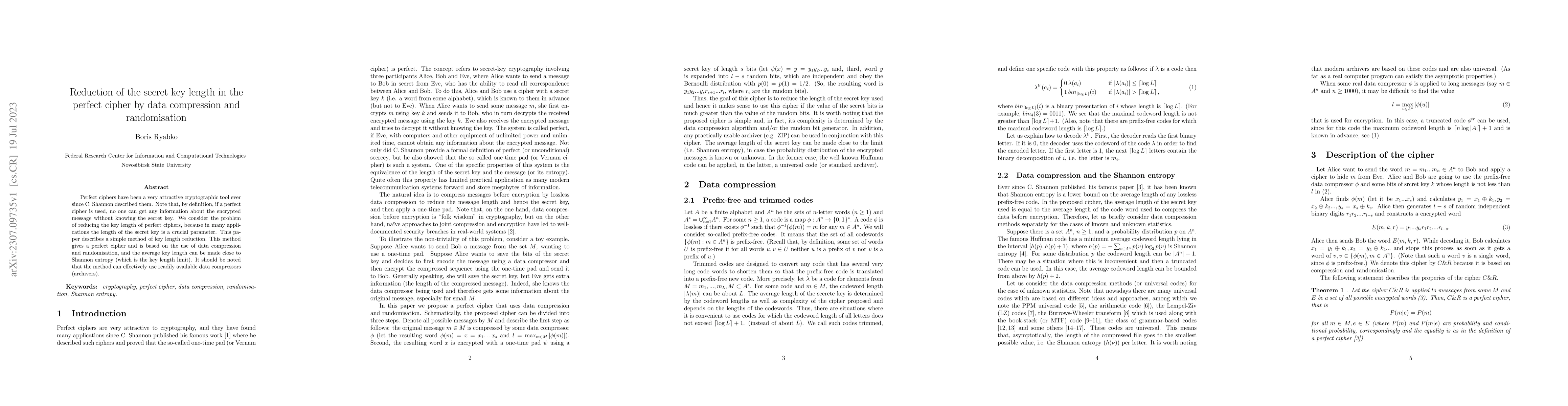 This paper proposes a method to reduce the secret key length in perfect ciphers using data compression and randomisation, achieving a key length close to Shannon entropy. The approach leverages existing data compressors to maintain perfect cipher properties while minimizing the key size.