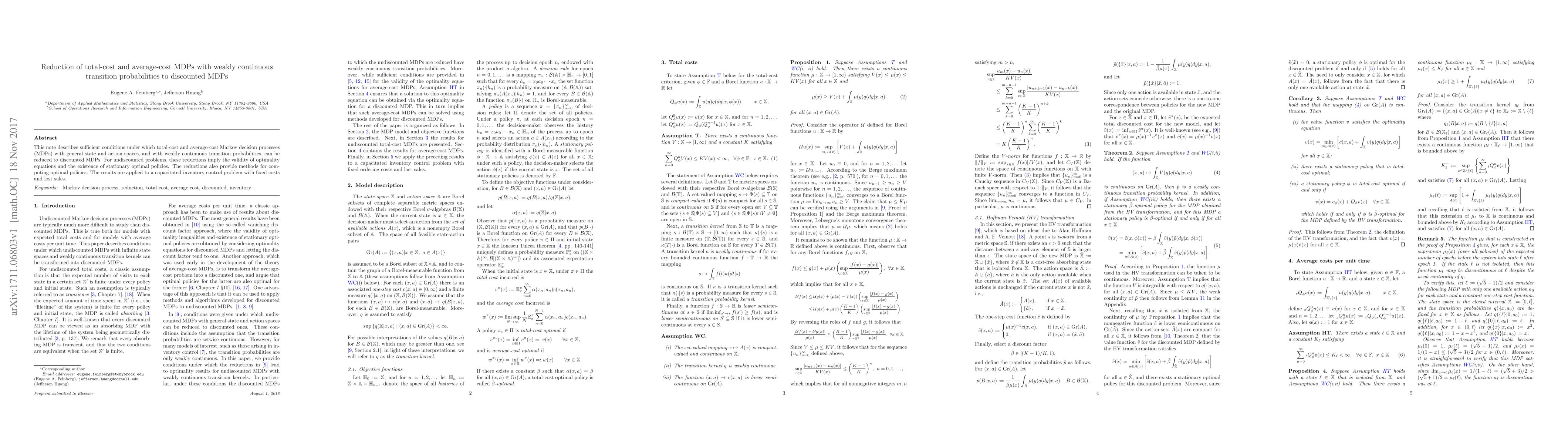 This paper outlines conditions for reducing total-cost and average-cost MDPs with weakly continuous transition probabilities to discounted MDPs, ensuring the existence of optimal policies and providing methods for their computation. The findings are exemplified through an application to a capacitated inventory control problem.