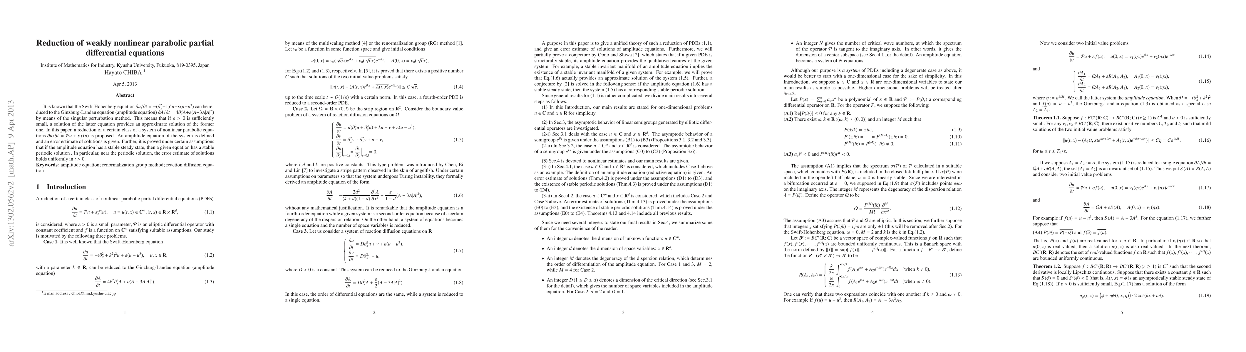 It is known that the Swift-Hohenberg equation $\partial u/\partial t = -(\partial_x^2 + 1)^2u + \varepsilon (u-u^3)$ can be reduced to the Ginzburg-Landau equation (amplitude equation) $\partial A/\partial t = 4\partial_x^2 A + \varepsilon (A-3A|A|^2)$ by means of the singular perturbation method. This means that if $\varepsilon >0$ is sufficiently small, a solution of the latter equation provides an approximate solution of the former one. In this paper, a reduction of a certain class of a system of nonlinear parabolic equations $\partial u/\partial t = \mathcal{P}u + \varepsilon f(u)$ is proposed. An amplitude equation of the system is defined and an error estimate of solutions is given. Further, it is proved under certain assumptions that if the amplitude equation has a stable steady state, then a given equation has a stable periodic solution . In particular, near the periodic solution, the error estimate of solutions holds uniformly in $t>0$.