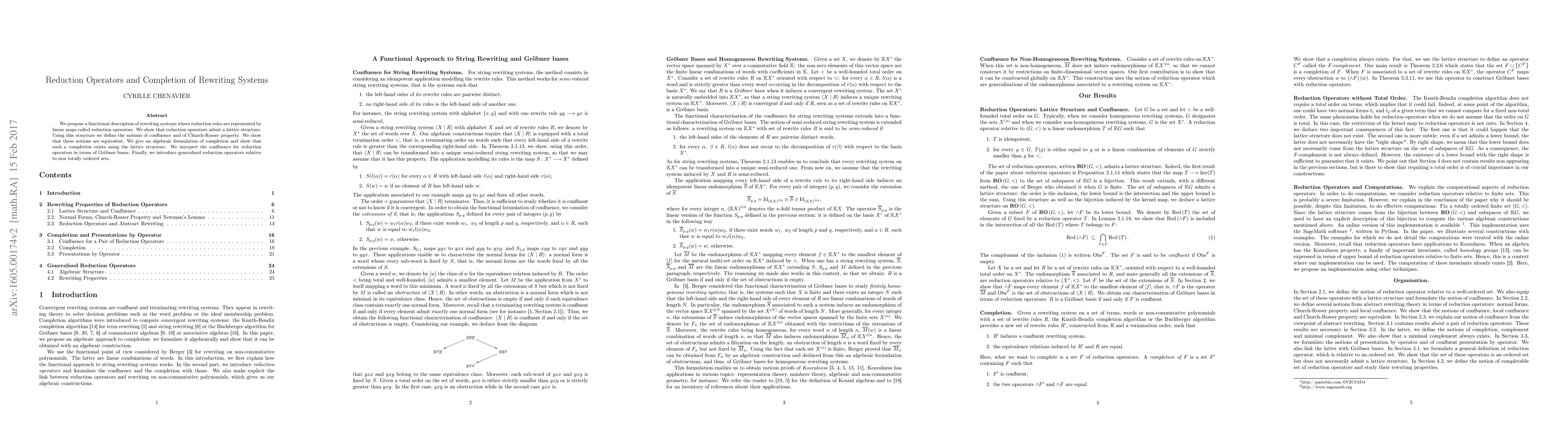 This paper presents an algebraic framework for rewriting systems using reduction operators, showing they form a lattice, and links confluence to the Church-Rosser property. It also proposes an algebraic approach to the completion of rewriting systems and connects reduction operators to Gröbner bases.